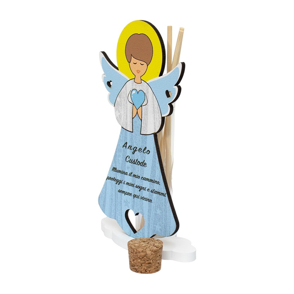 L'angioletto si presenta finemente decorato su fondo celeste e con base bianca, sul retro vi è la provetta in vetro con tappo in sughero e bastoncini in legno che funge sia da profumatore per ambiente (non incluso) sia da portaconfetti.