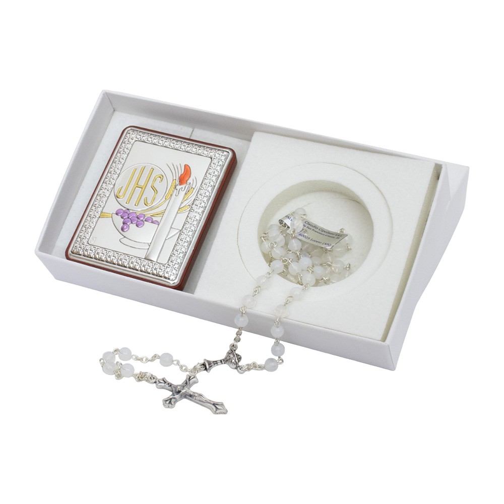 Carinissima bomboniera Prima Comunione completa di cofanetto con all'interno un quadretto e una coroncina del rosario.