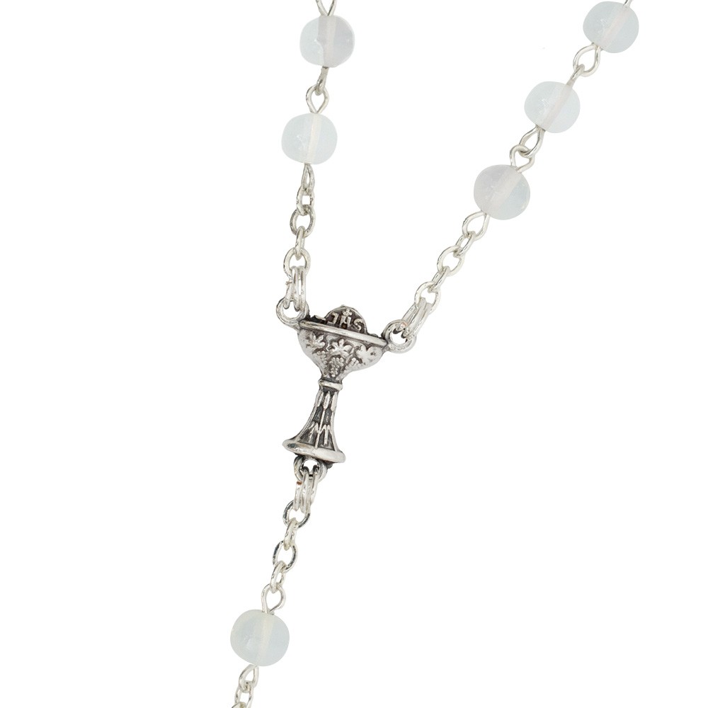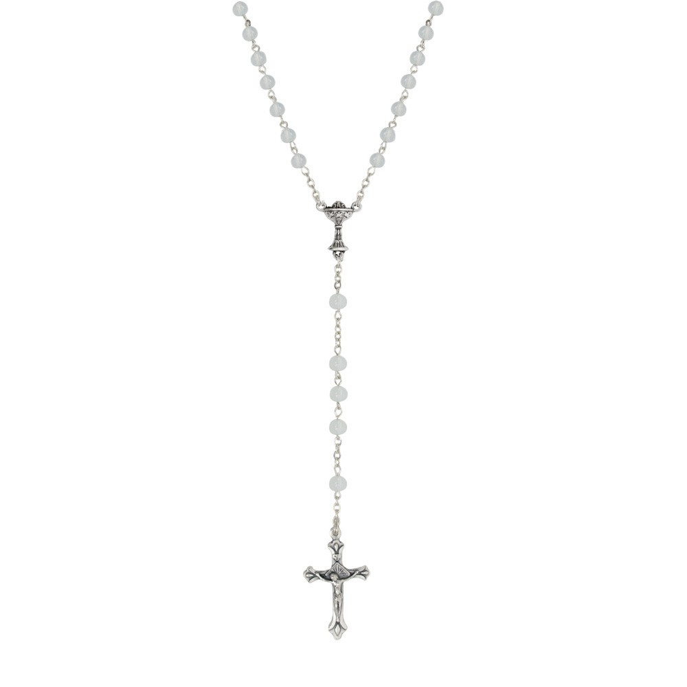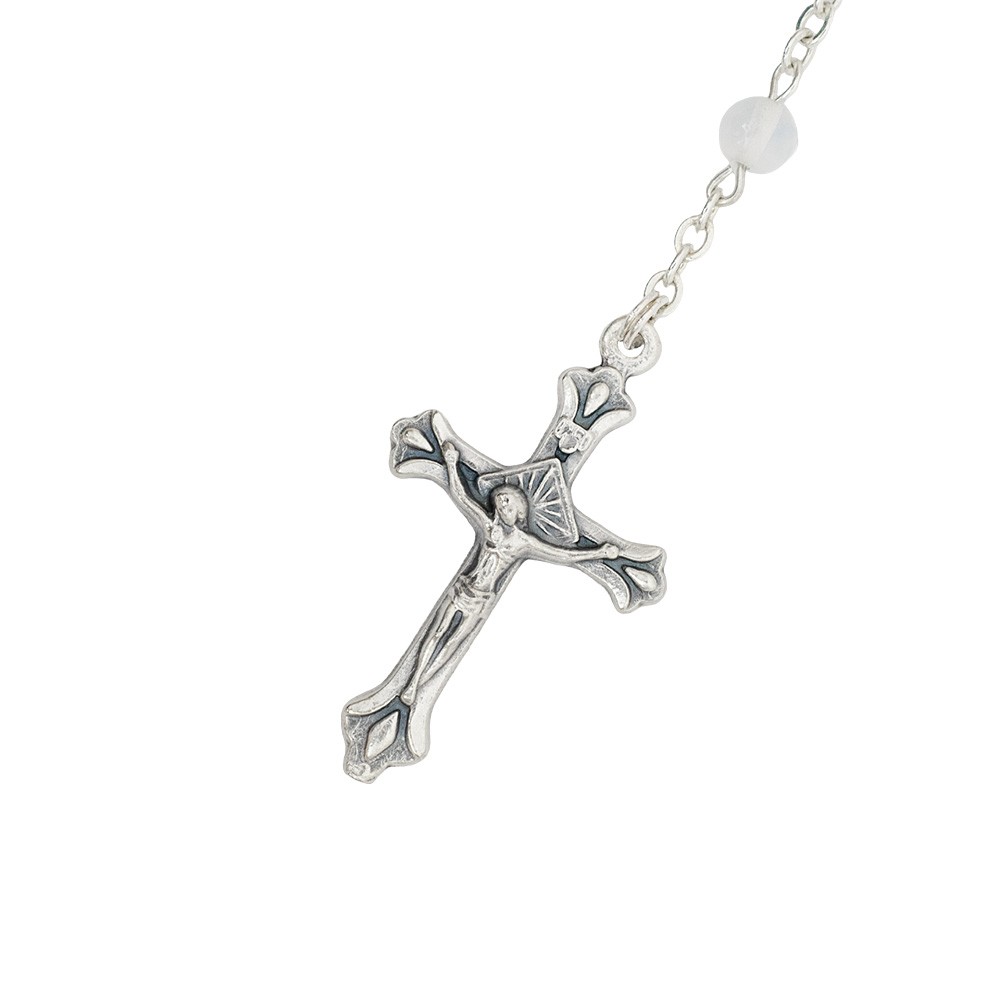 La coroncina del rosario è realizzata con perle in vetro, completa di crociera e croce in metallo argentato.