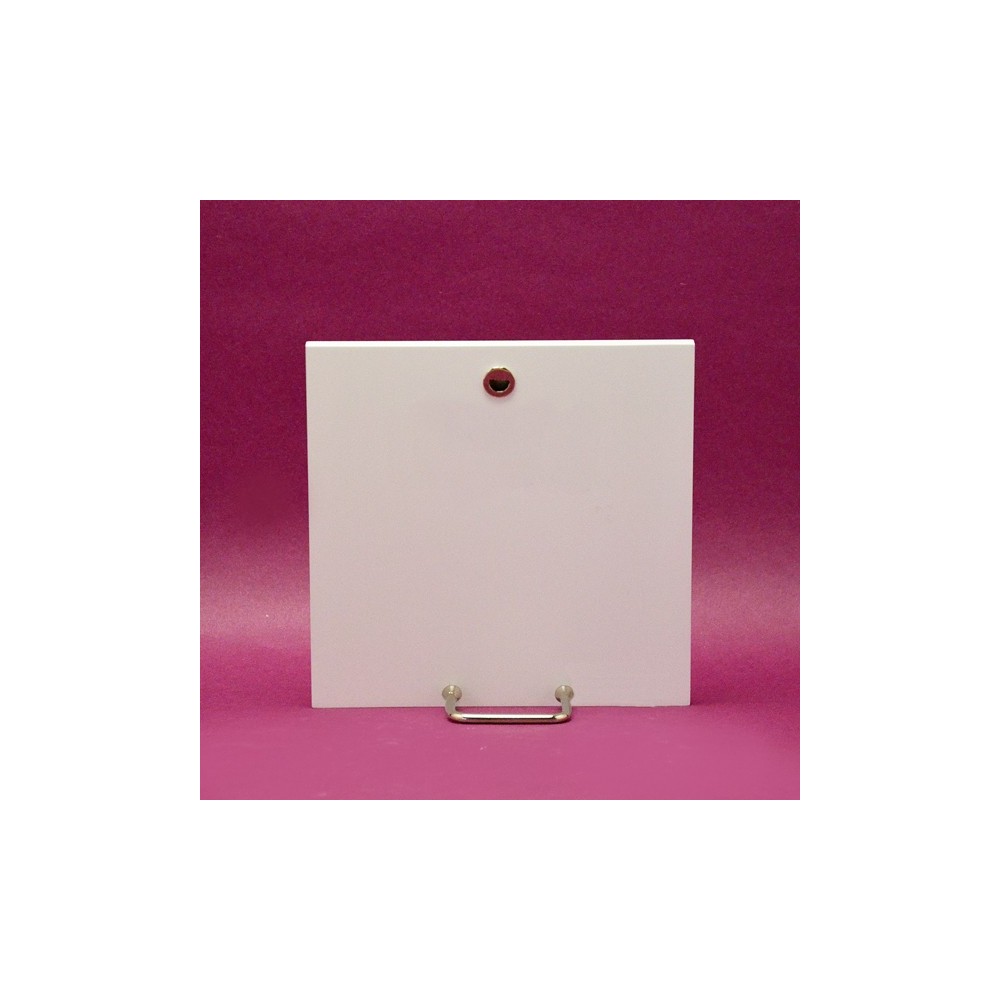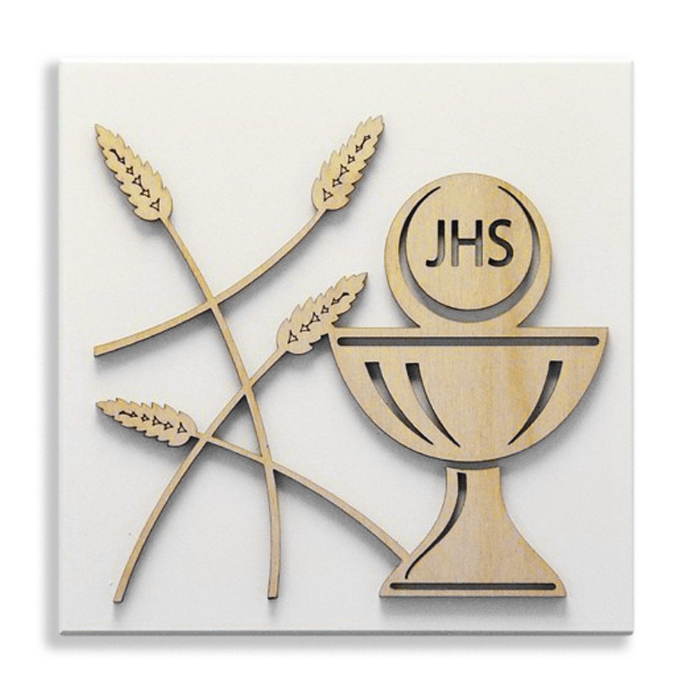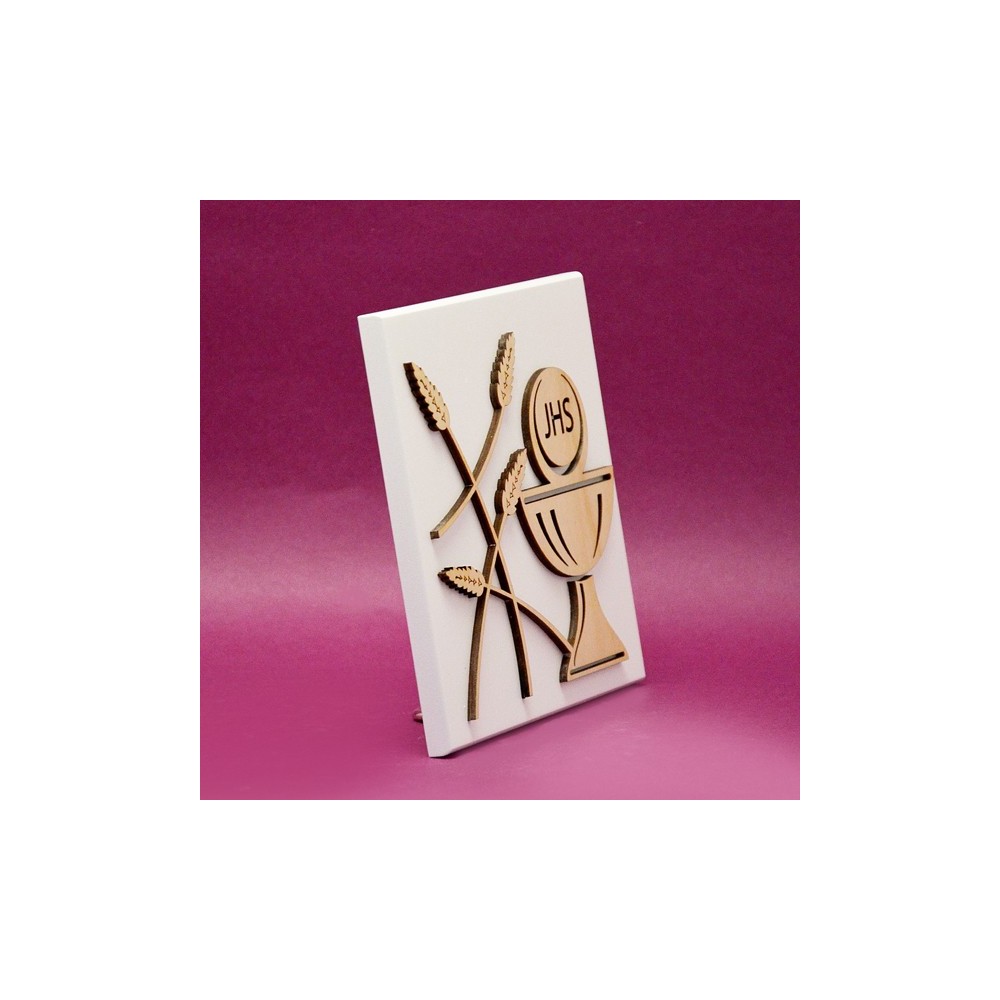 E' realizzato su una pannello in legno laccato bianco, con intarsi a laser. Può essere usato come appoggio (con piedino in metallo) o appeso al muro. Ideale come bomboniera per Prima Comunione. Corredato di scatola.