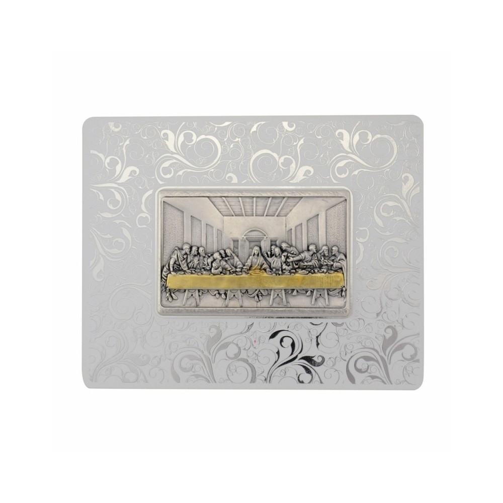 Realizzato in legno a forma rettangolare con placchetta in zama raffigurante l'ULTIMA CENA. I bordi del quadretto sono in legno laccato bianco con ricchi decori floreali di colore argento. Completo di foro e piedino in metallo per appenderlo e per essere appoggiato. Corredato di scatola. Ideale come bomboniera per la Prima Comunione.