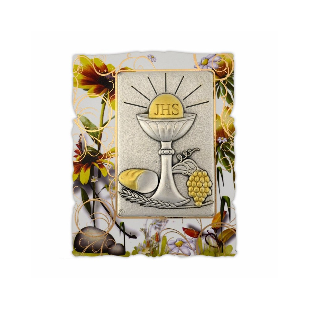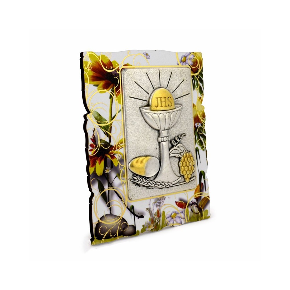 Quadro sagomato in legno decorato con fiori, con placchetta applicata. La placchetta è in zama argentata con i simboli della Prima Comunione (Calice, Ostia, pane e grappolo D'uva). Corredato di piedino d'appoggio. Scatolato. Prodotto 100% Made in Italy. Ideale come bomboniera per la Prima Comunione.