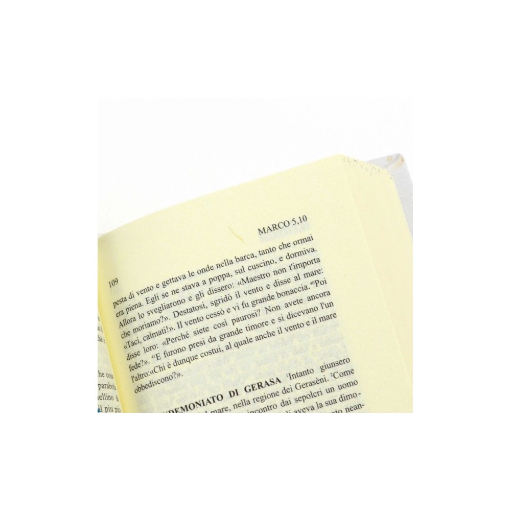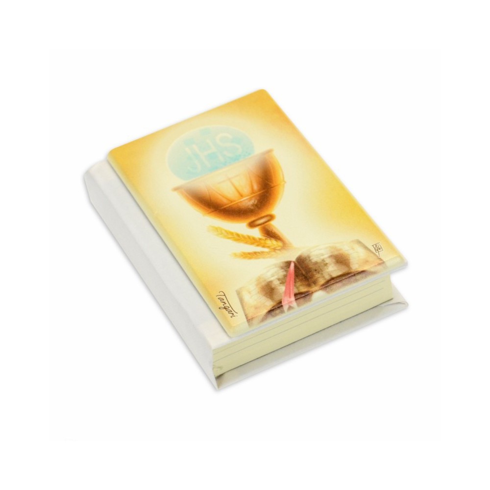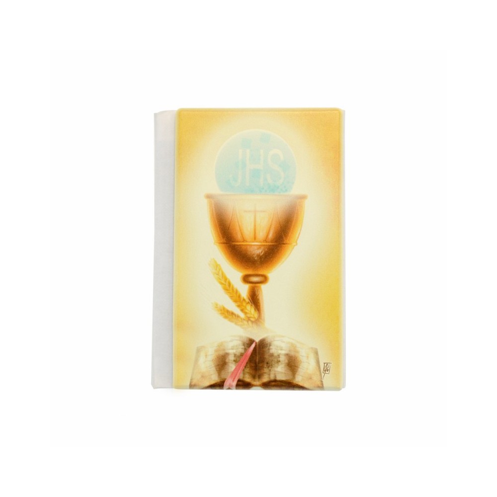Con placca di legno applicata sulla copertina su cui è dipinta l'immagine del Calice e la scritta JHS. Il vangelo è alto 11 cm ed è largo 7 cm. Realizzato e prodotto da un'azienda italiana, garantendo l'unicità di ogni articolo e cura nei minimi dettagli.