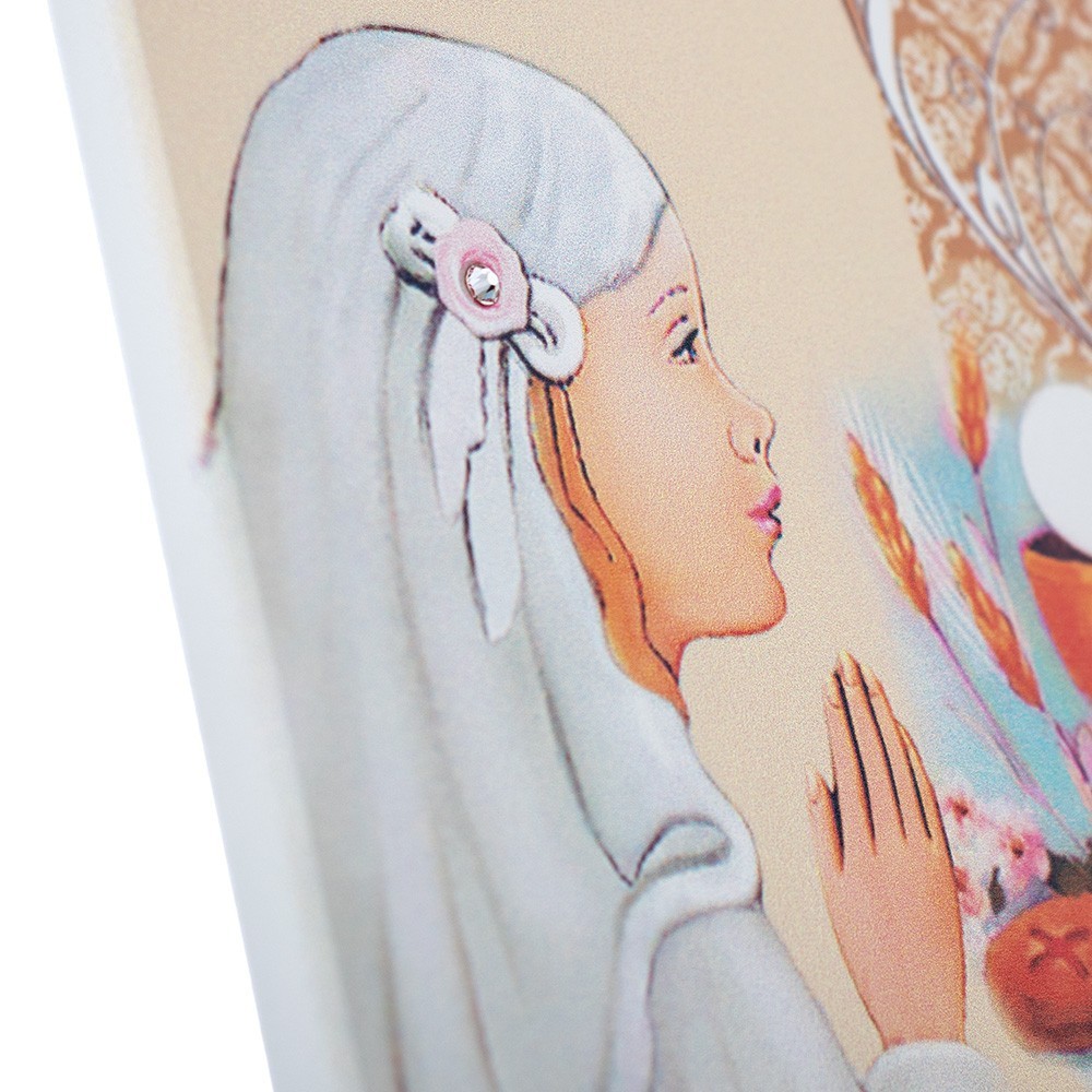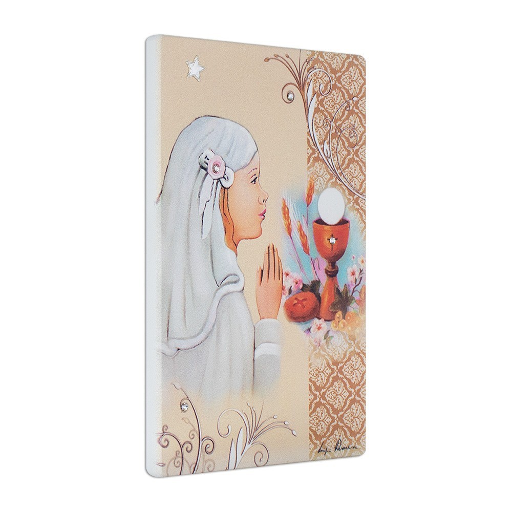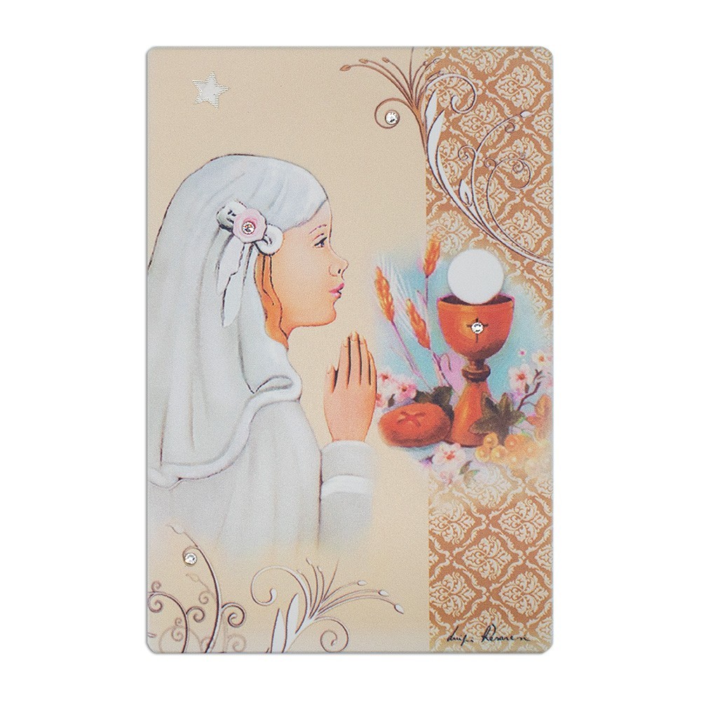Questo quadretto (formato 10x15 cm) è arricchito con strass e stellina in argento. Può essere usato sia da parete che d'appoggio, adatto come bomboniera per la Prima Comunione Bambina.