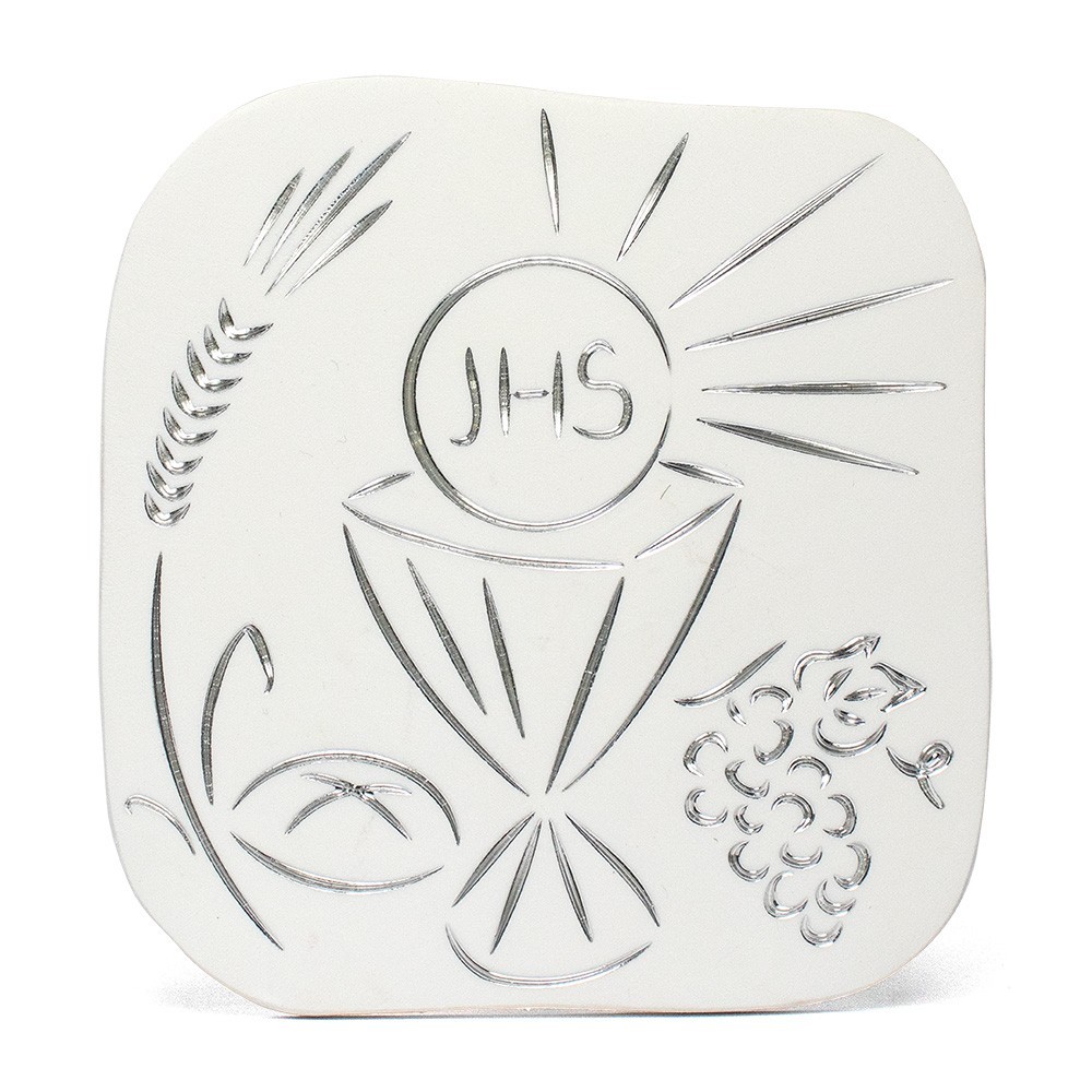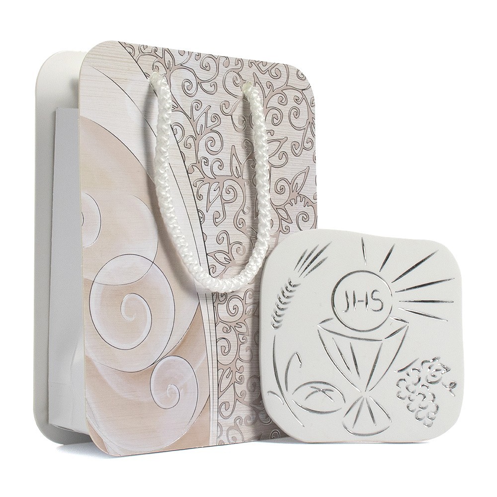 Bomboniera Prima Comunione completa di quadretto e shopper. Il quadretto dal design moderno color bianco si presenta con decori intagliati color argento che rappresentano i simboli della Prima Comunione (calice, uva, pane e spighe). Il tutto completo di sacchetto rigido decorato finemente.