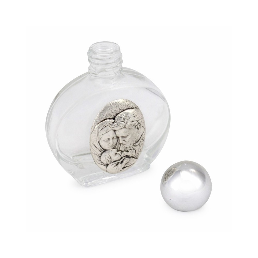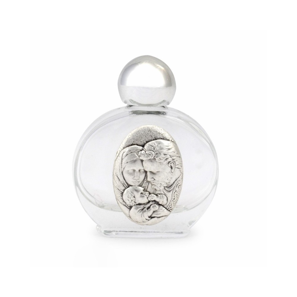 Bottiglietta in vetro per acqua Santa con immagine in rilievo di una Sacra Famiglia. Il tappo è in plastica color argento. Prodotto italiano.