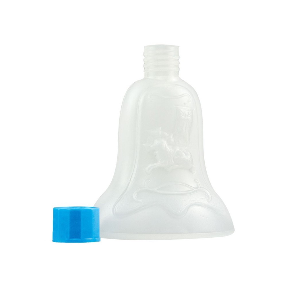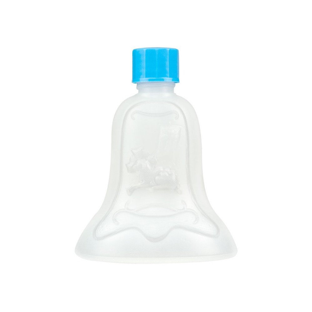 Bottiglietta per acqua benedetta da 100 ml, realizzata in plastica a forma di campana e con tappo di colore celeste.