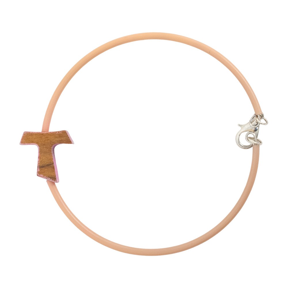 Bracciale in caucciù rosa antico, completo di tau in legno e moschettone in metallo per la chiusura.