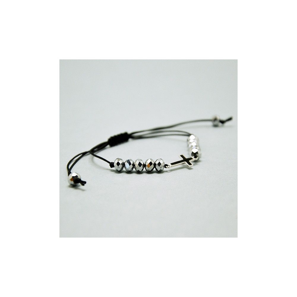 Bracciale Rosario in corda con Croce in Argento e dieci grani in vetro argentati. Tirando le corde si adatta a tutti i tipi di polso. Idea Regalo, scatolato.