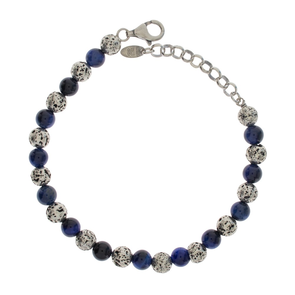 Braccialetto in argento 925 con grani in pietra lavica e occhio di tigre blu.