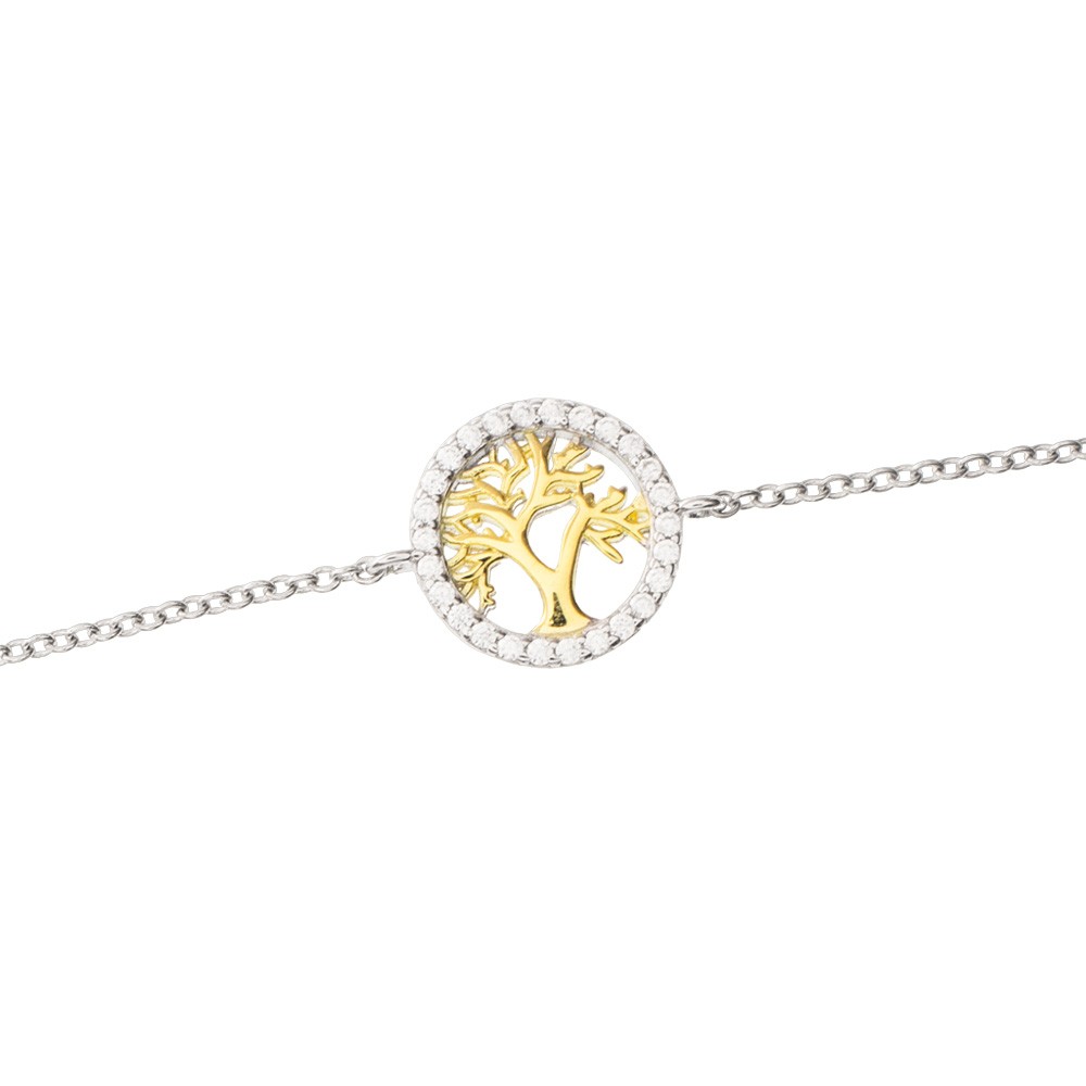 Il bracciale è interamente in argento 925 con finitura rodio/oro, ciondolo circolare a forma di albero della vita e chiusura regolabile (lunghezza 16+3 cm).