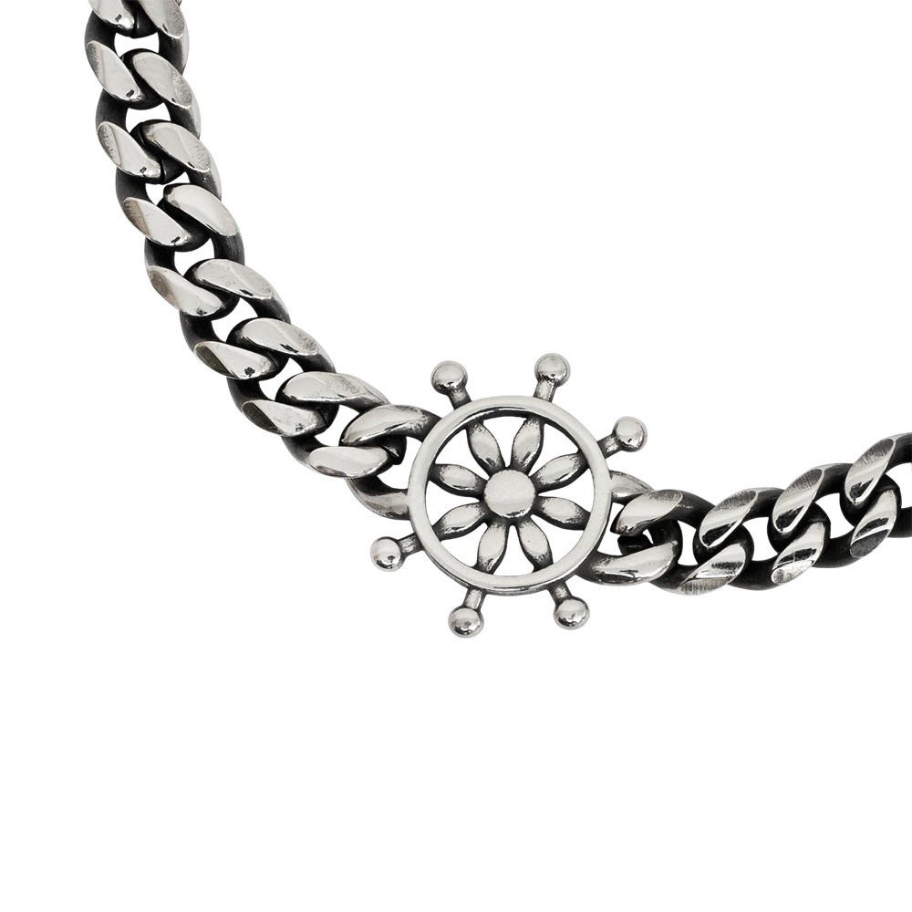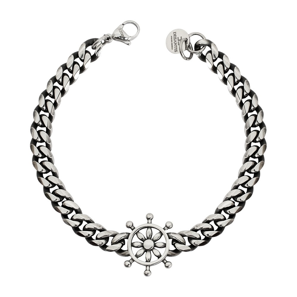 Bracciale uomo interamente in acciaio ossidato brunito, dallo stile contemporaneo. Il bracciale è arricchito con il simbolo del timone (simbolo di guida e di forza), completo di pratica chiusura con gancio, per una vestibilità comoda e sicura.