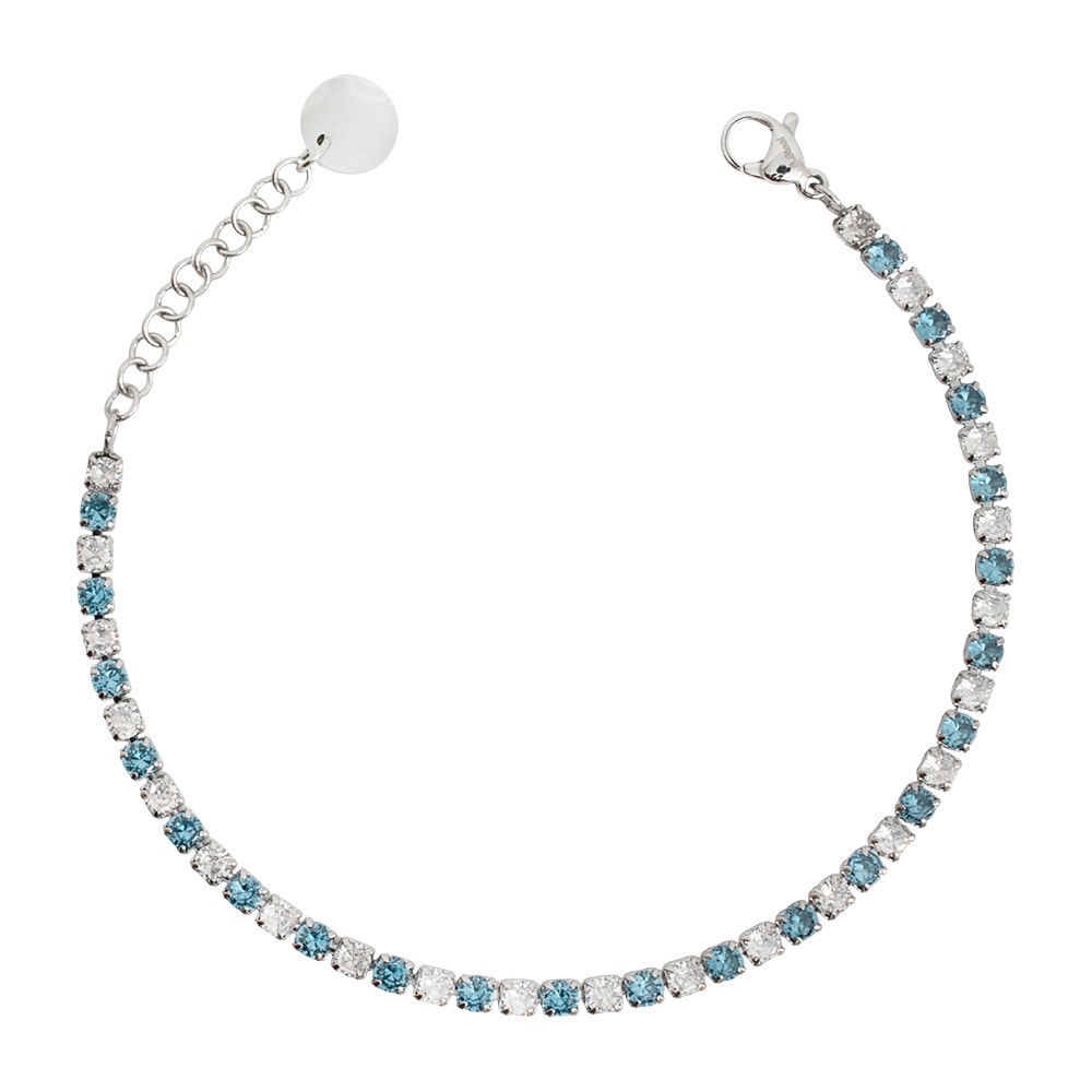 Bracciale modello Tennis in acciaio inossidabile, arricchito da zirconi celesti e trasparenti. Il design essenziale e luminoso rende questo accessorio elegante e versatile, perfetto da indossare ogni giorno o nelle occasioni speciali.