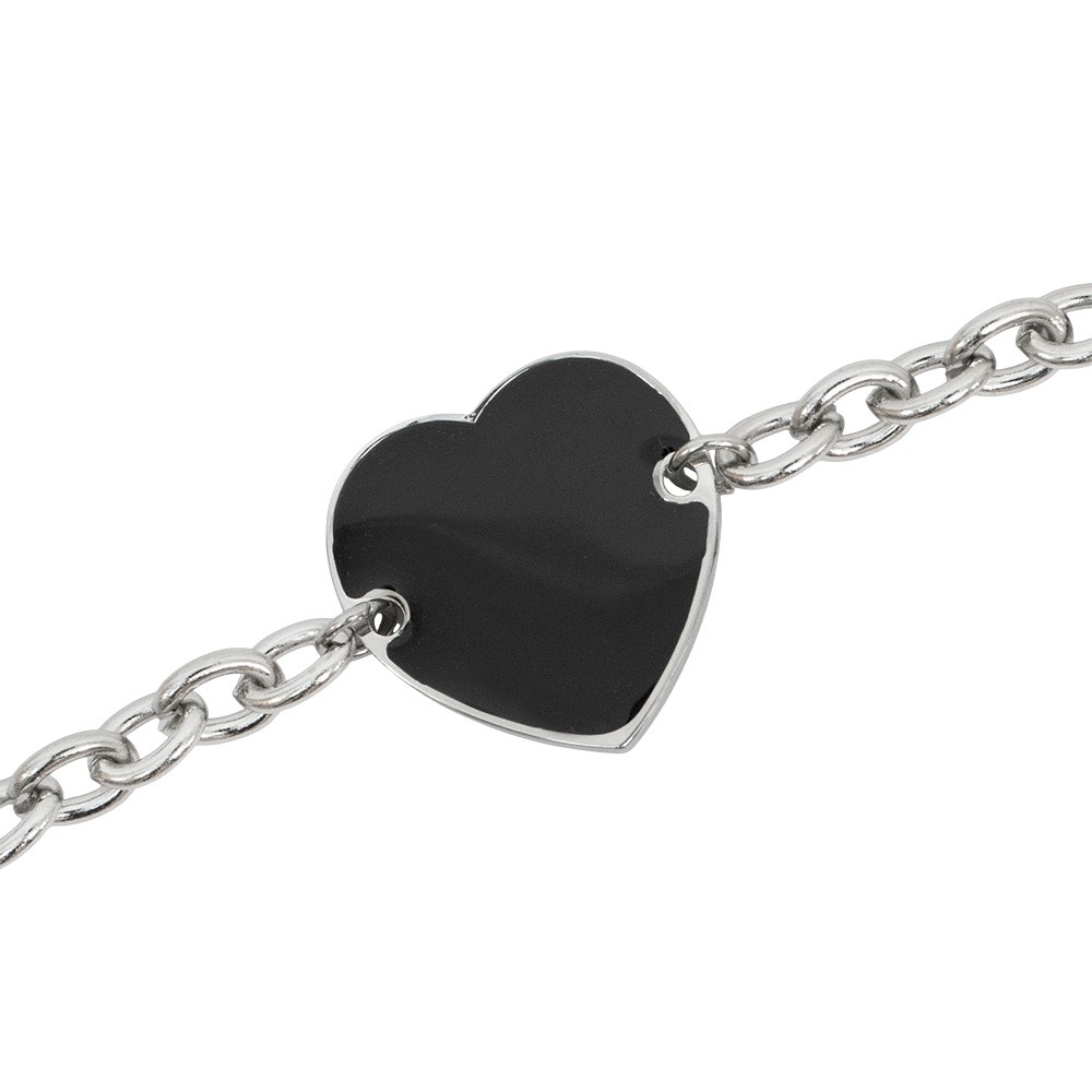 La catena a maglie ovali da 19.5 cm sostiene un charm piatto a forma di cuore con impronta e smalto nero sul retro (altezza 1,8 cm), corredato da una pratica chiusura a moschettone.