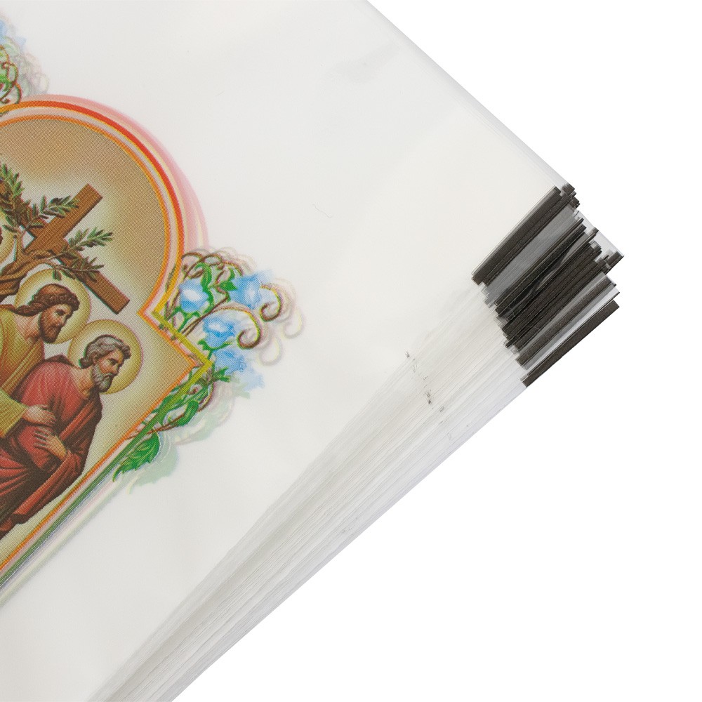 Confezione da 200 bustine in nylon con immagine di Gesù Buon Pastore.