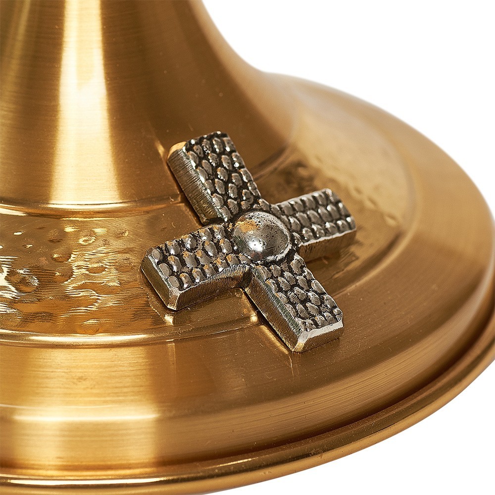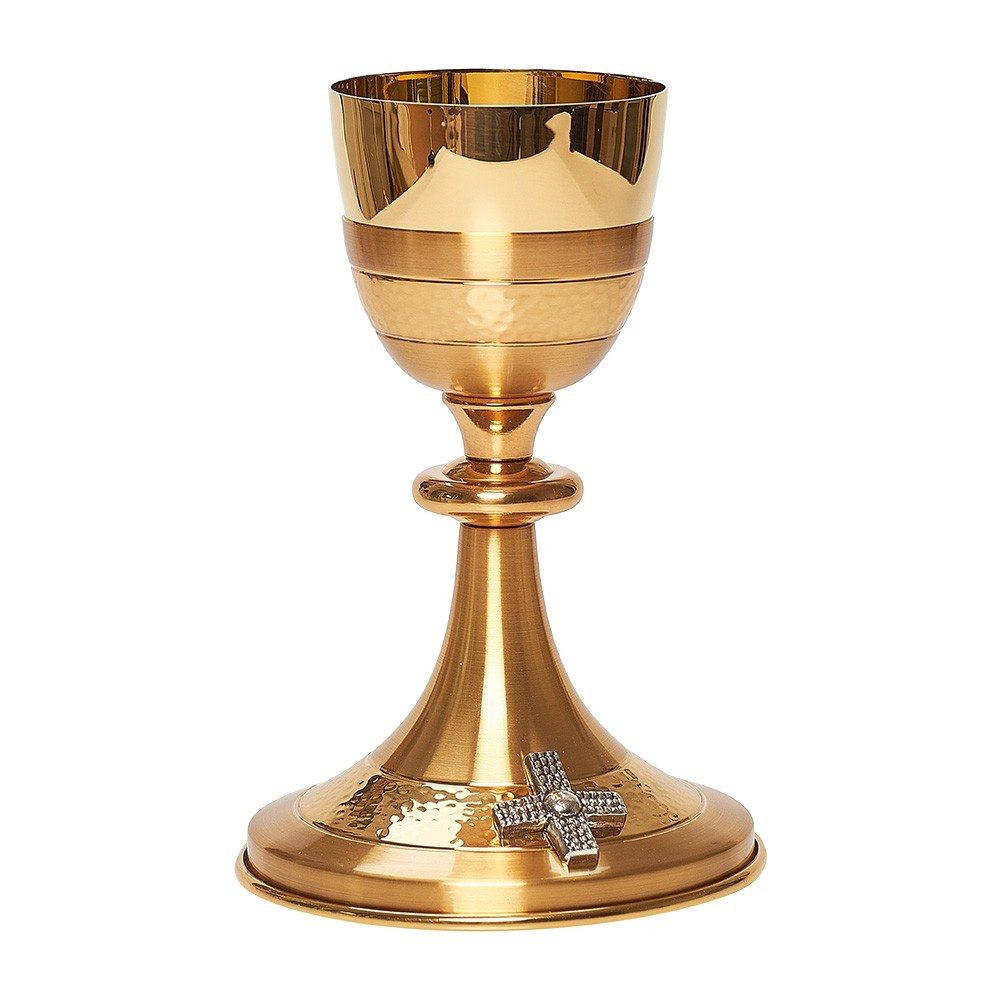 Calice in ottone dorato martellato. Sulla base del calice vi è applicata una piccola croce.