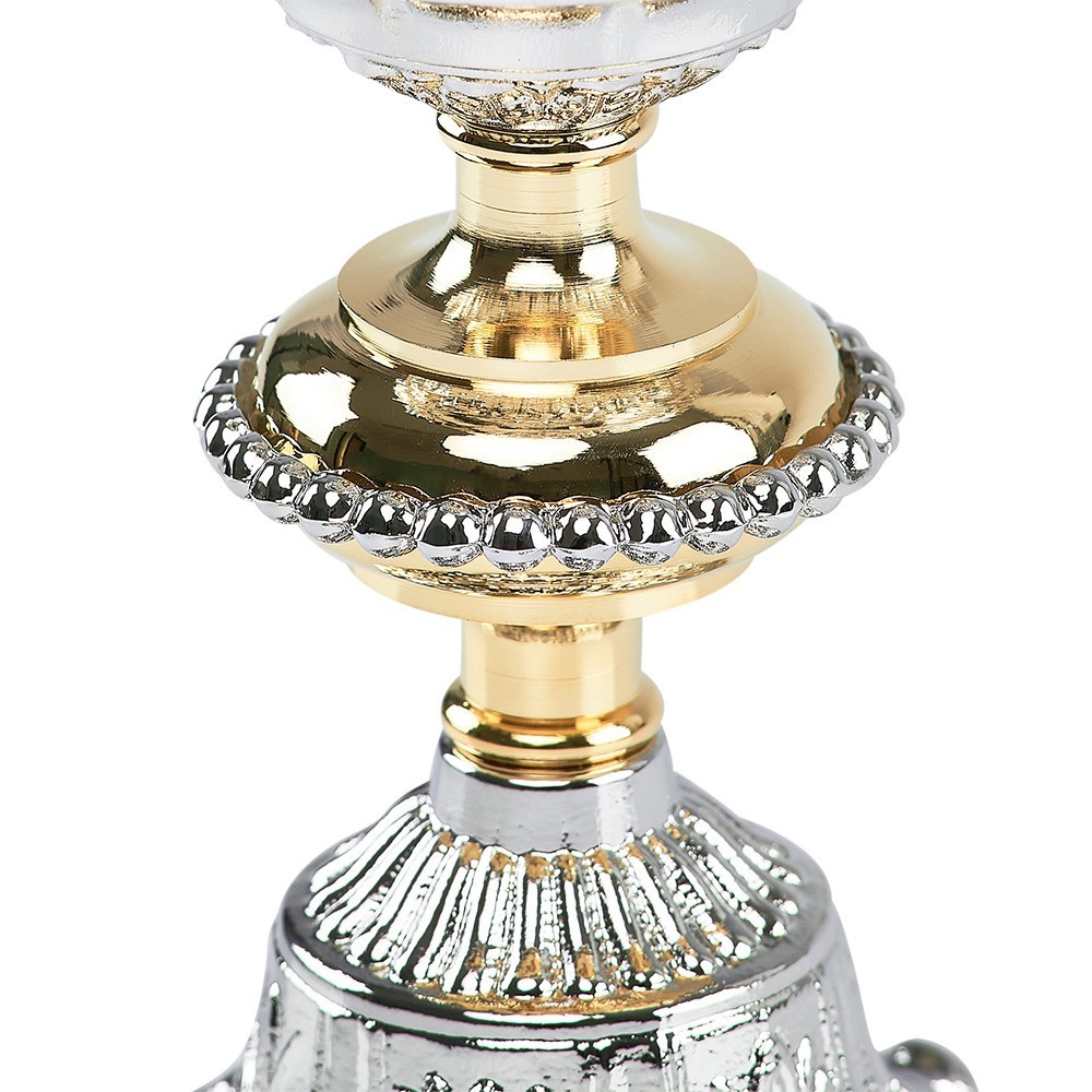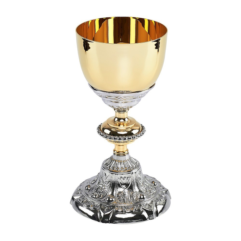 Questo grazioso set è composto da un calice e una pisside in stile barocco, con finitura oro e argento.