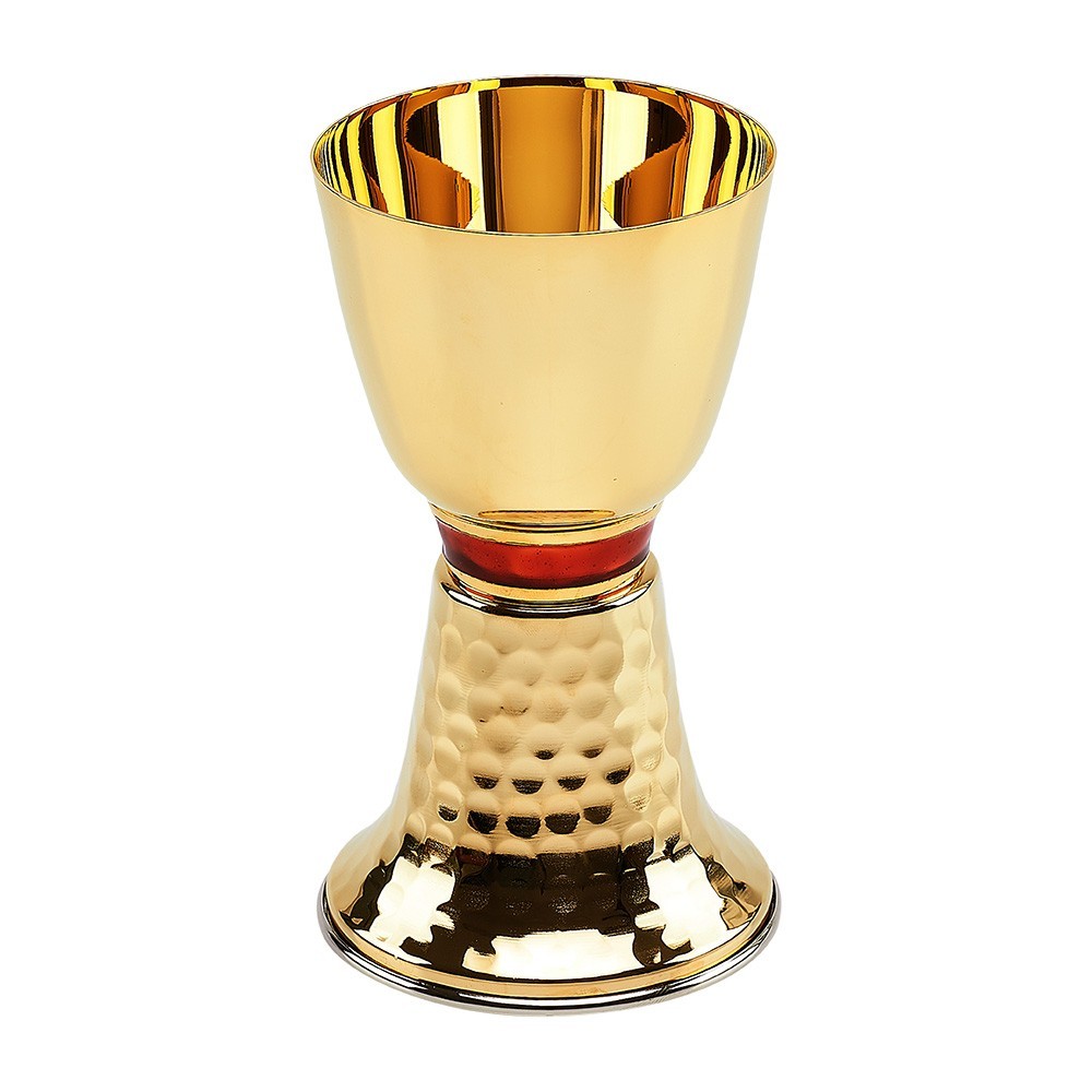 Il set è composto da un calice e una pisside realizzati in ottone dorato lucido, base finemente lavorata e anelo smaltato di colore rosso.