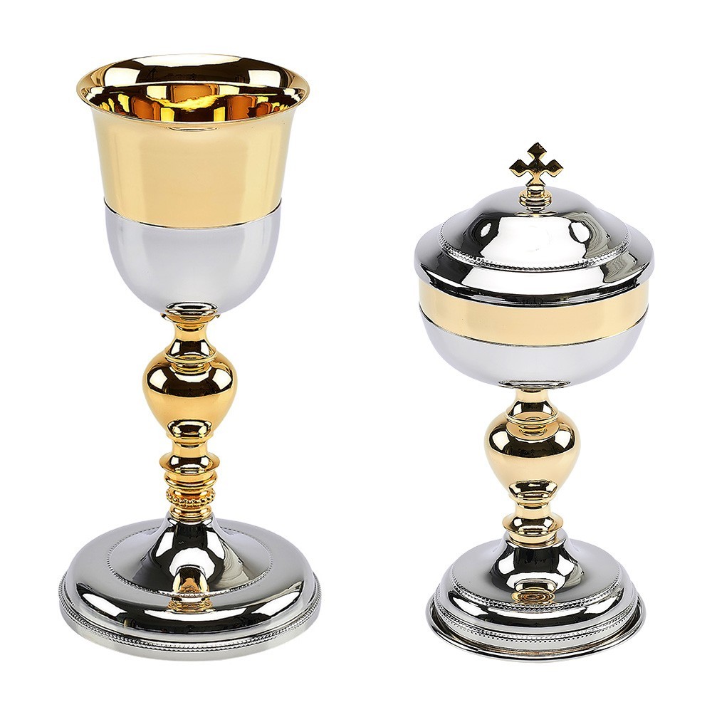 Questo set è composto da un calice euna pisside reliazzati interamente in ottone bicolore lucido, con finitura argento e oro.