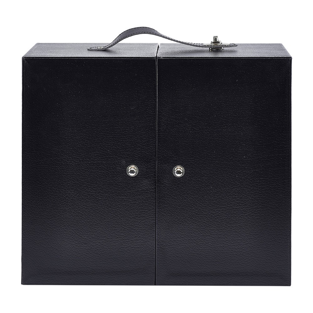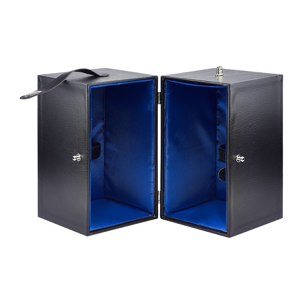 Bauletto porta calice e porta pisside in pelle e legno, con interno foderato di colore blu. Questo pauletto si presenta a due scompartimenti, pùò contenere un calice, una pisside (di altezza max 28 cm) e una patena con diametro massimo di 14 cm.