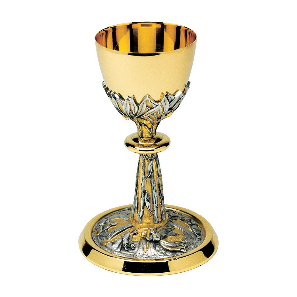 Calice liturgico alto 20 cm, realizzato in ottone bicolore con la tecnica della fusione a cera persa. La base è finemente decorata con la rappresentazione del Getsemani, l'orto degli ulivi, mentre la colonna e il sottocoppa sono decorati con tralci di ulivo.