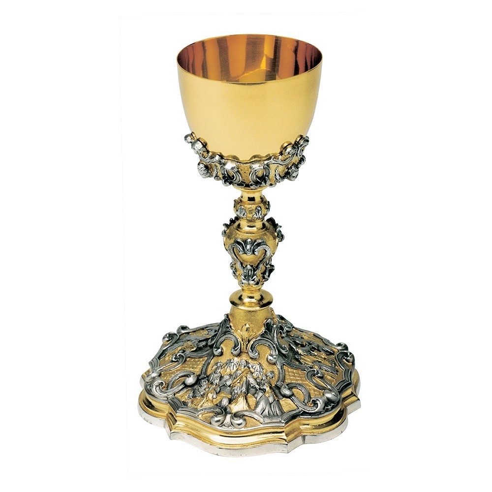 Calice eucaristico realizzato in ottone bicolore mediante la tecnica della fusione a cera persa. Sulla base sono raffigurate le scene di miracoli, mentre sul sottocoppa e la parte centrale riportano decori con ornamenti astratti.