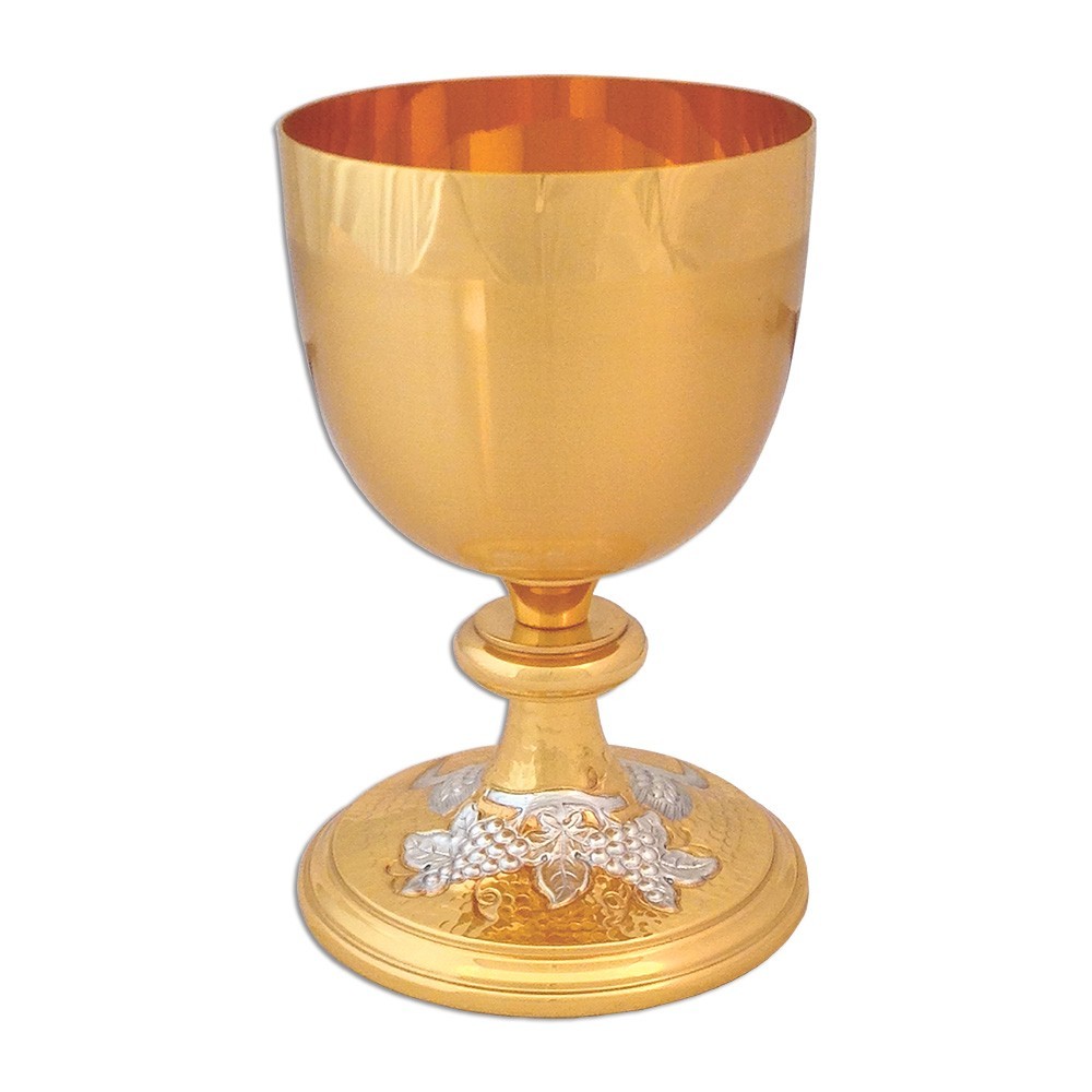Calice eucaristico in ottone bicolore cesellato, con raffigurazioni di grappoli d'uva sul piede.
