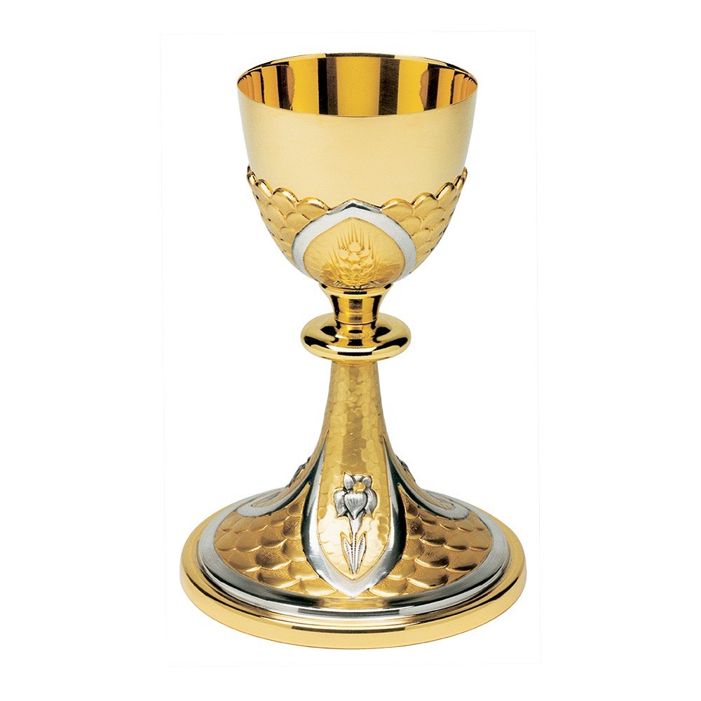 Questo calice eucaristico è stato realizzato in ottone bicolore e decorato sulla base con rappresentazioni di gigli sbalzati. Il sottocoppa è ornato da spighe stilizzate.