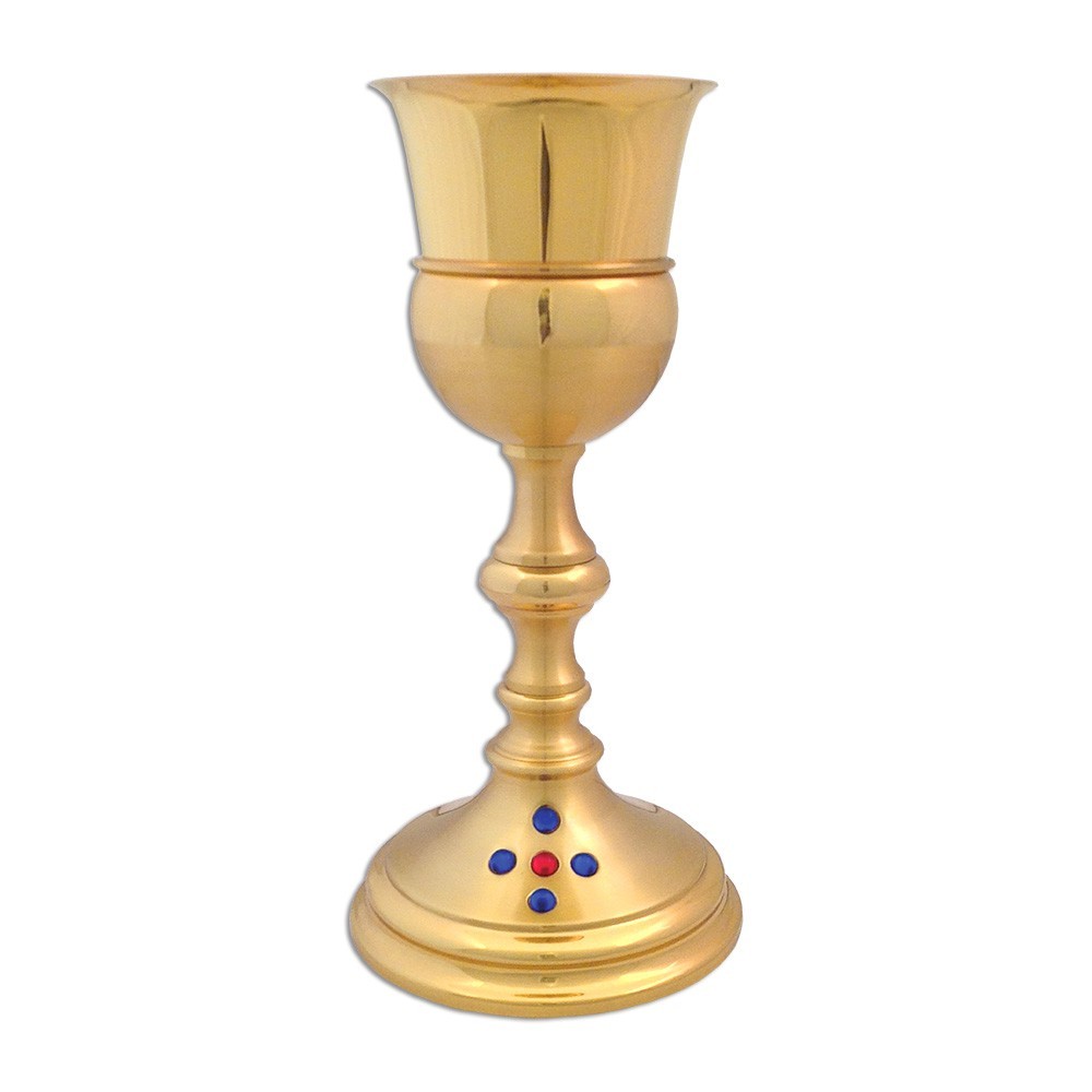 Calice in ottone dorato e satinato. Questo calice liturgico è ornato con pietre preziose incastonate nella base formando una croce.