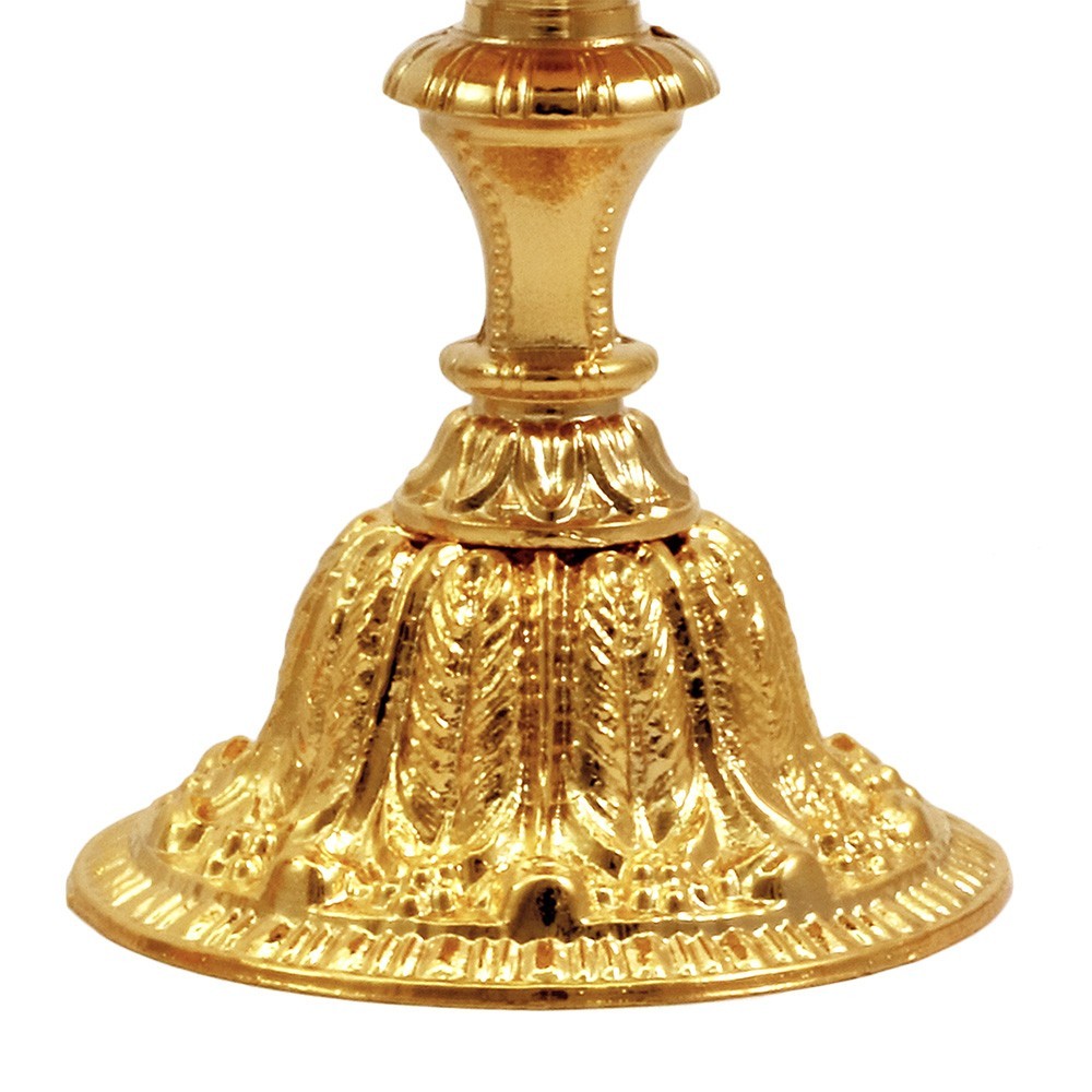 Questo calice da messa è realizzato interamente in ottone con doratura 24 k, la base e il nodo sono similmente decorati in stile barocco.