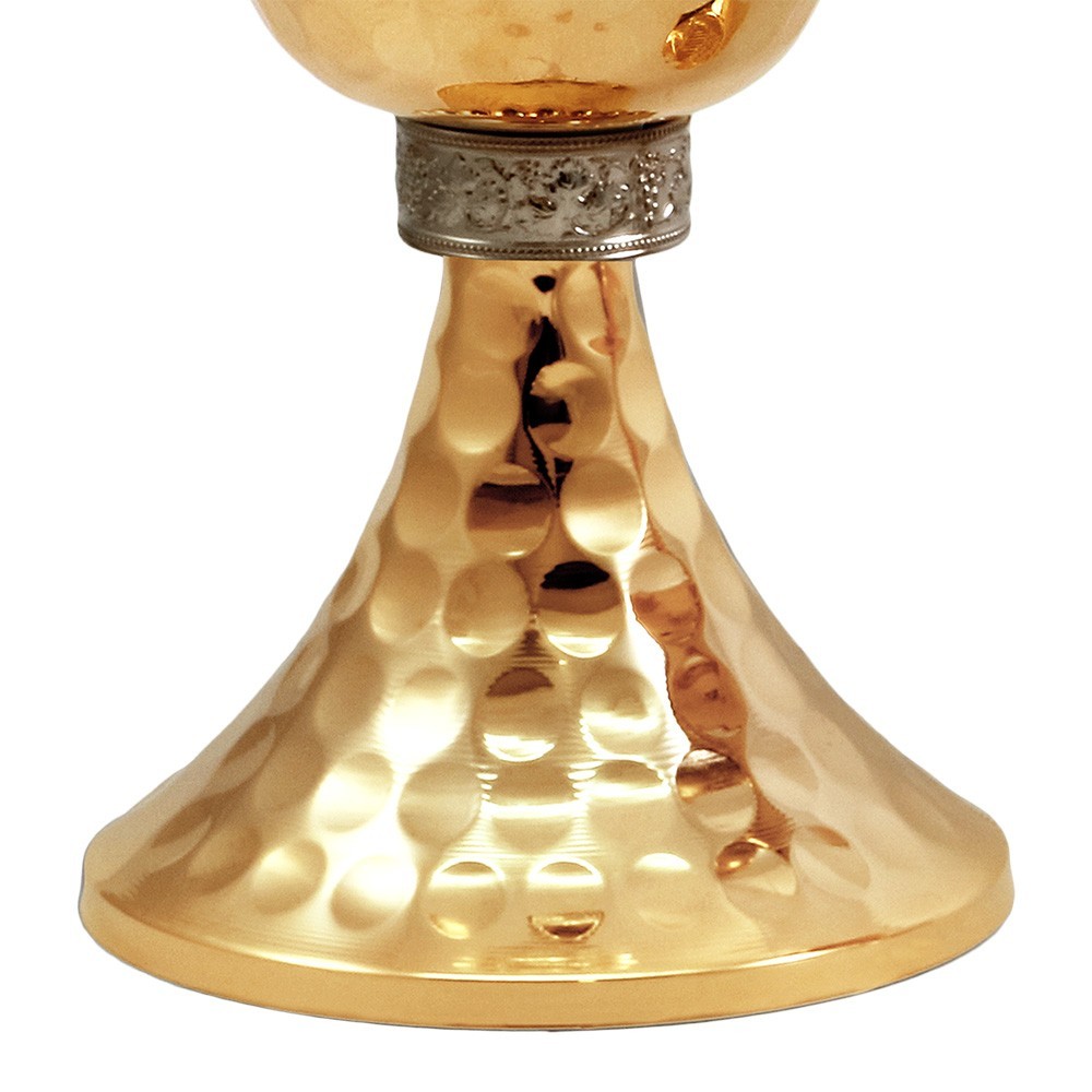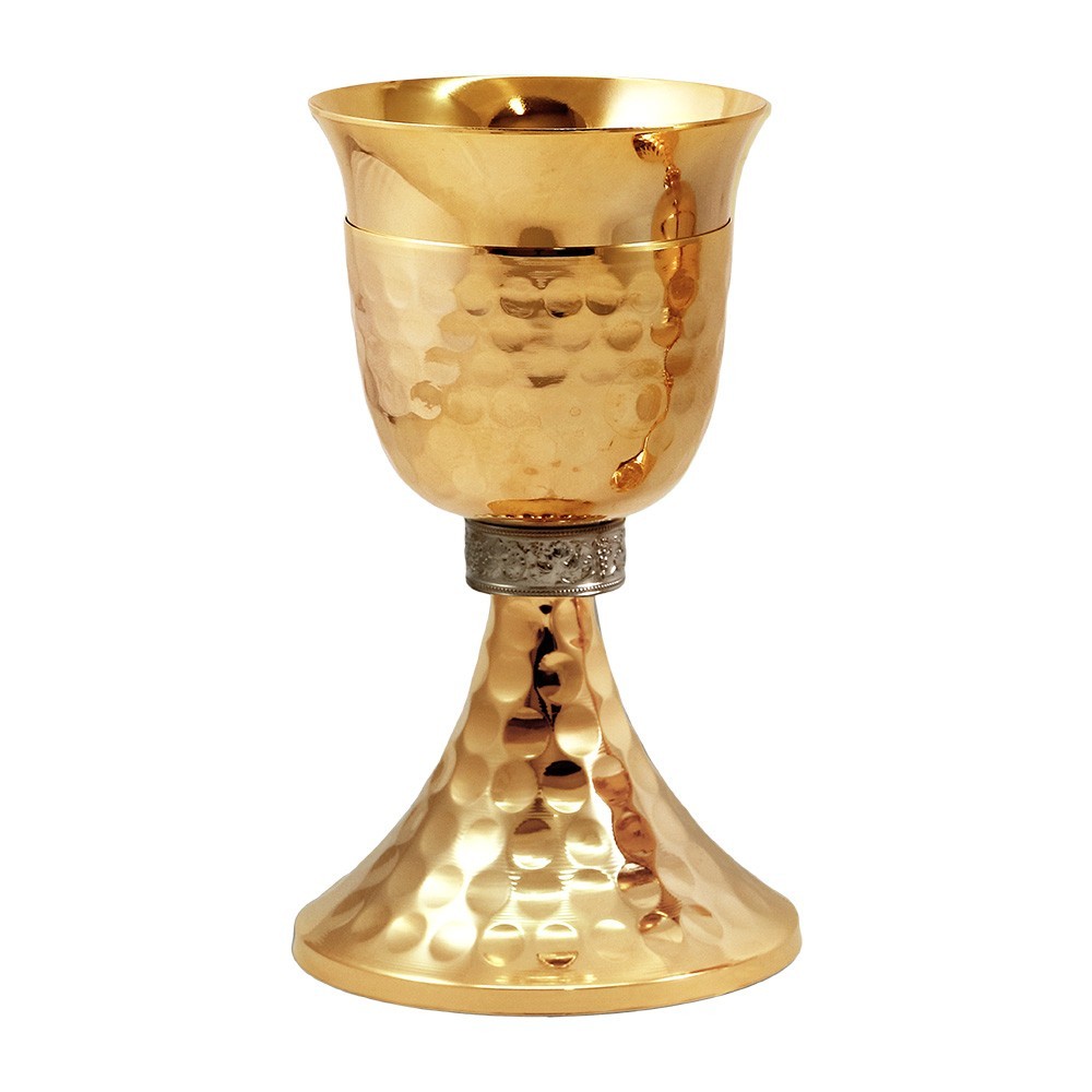 Calice eucaristico in ottone dorato 24k, con base e sottocoppa martellata.