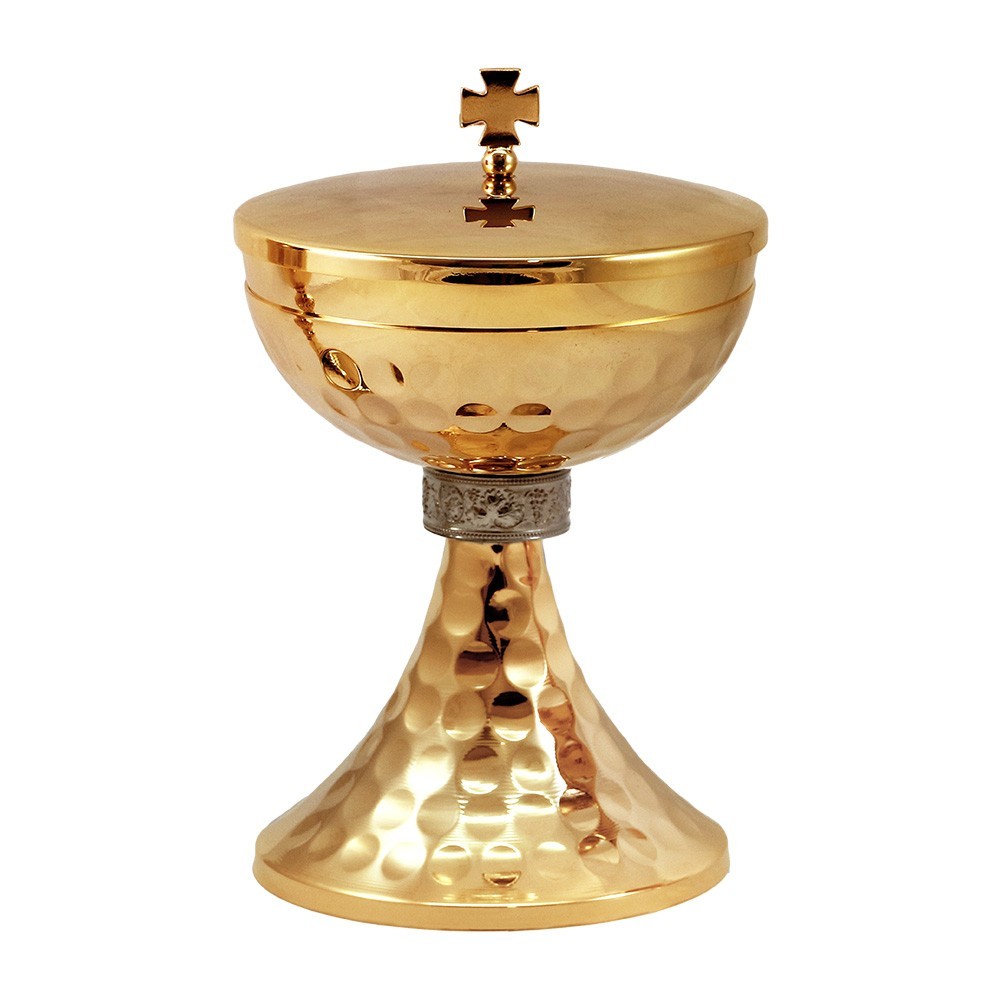 Set per la liturgia composto da calice e pisside in ottone con doratura garantita 24 k. Questo set liturgico si presenta con base e sottocoppa martellata, con nodo decorato "Uva e foglie di vite".