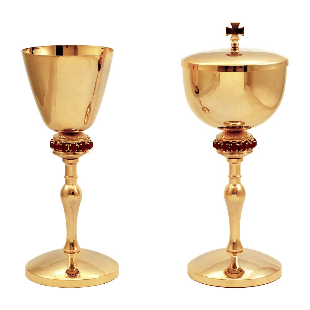 Servizio per la liturgia composto da un calice e una pisside in ottone con doratura garantita 24 k. Questo elegante e raffinato set liturgico si presenta con nodo decorato con pietre rosse incastonate.