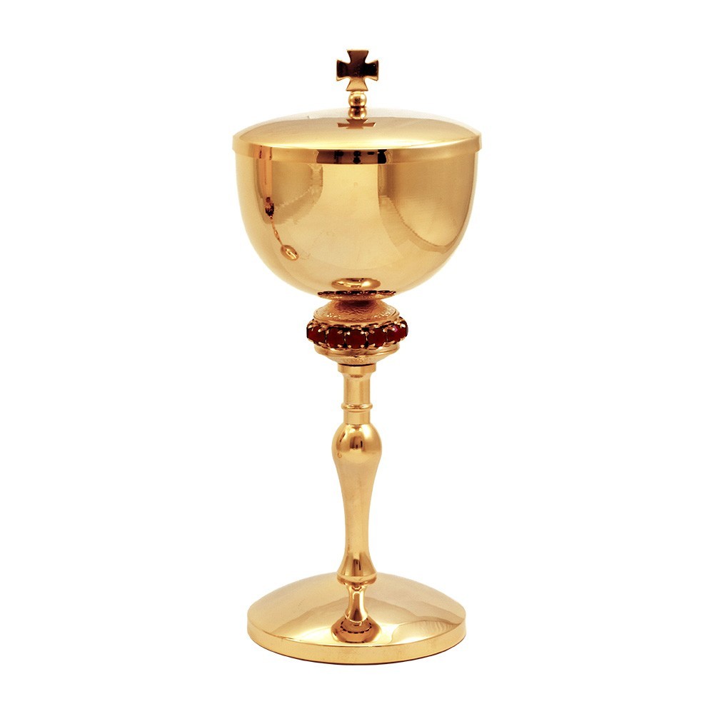 Set calice e pisside in ottone dorato con nodo arricchito con pietre rosse.