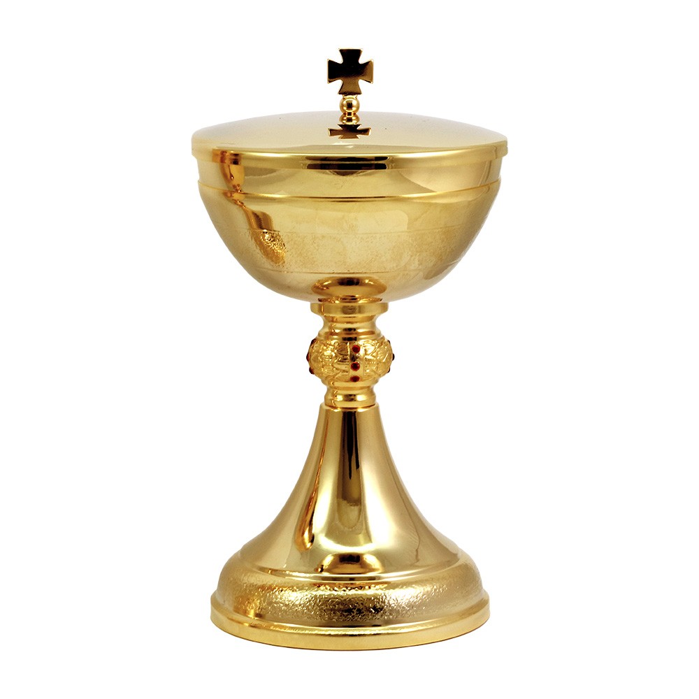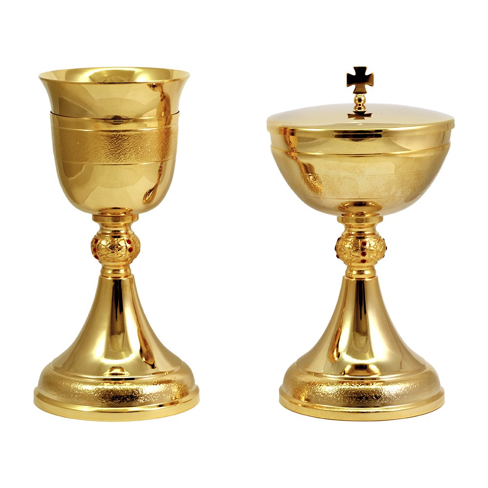 Calice e pisside da messa in ottone dorato con sottocoppa e base lavorata. Il nodo è in fusione arricchito con pietre rosse.