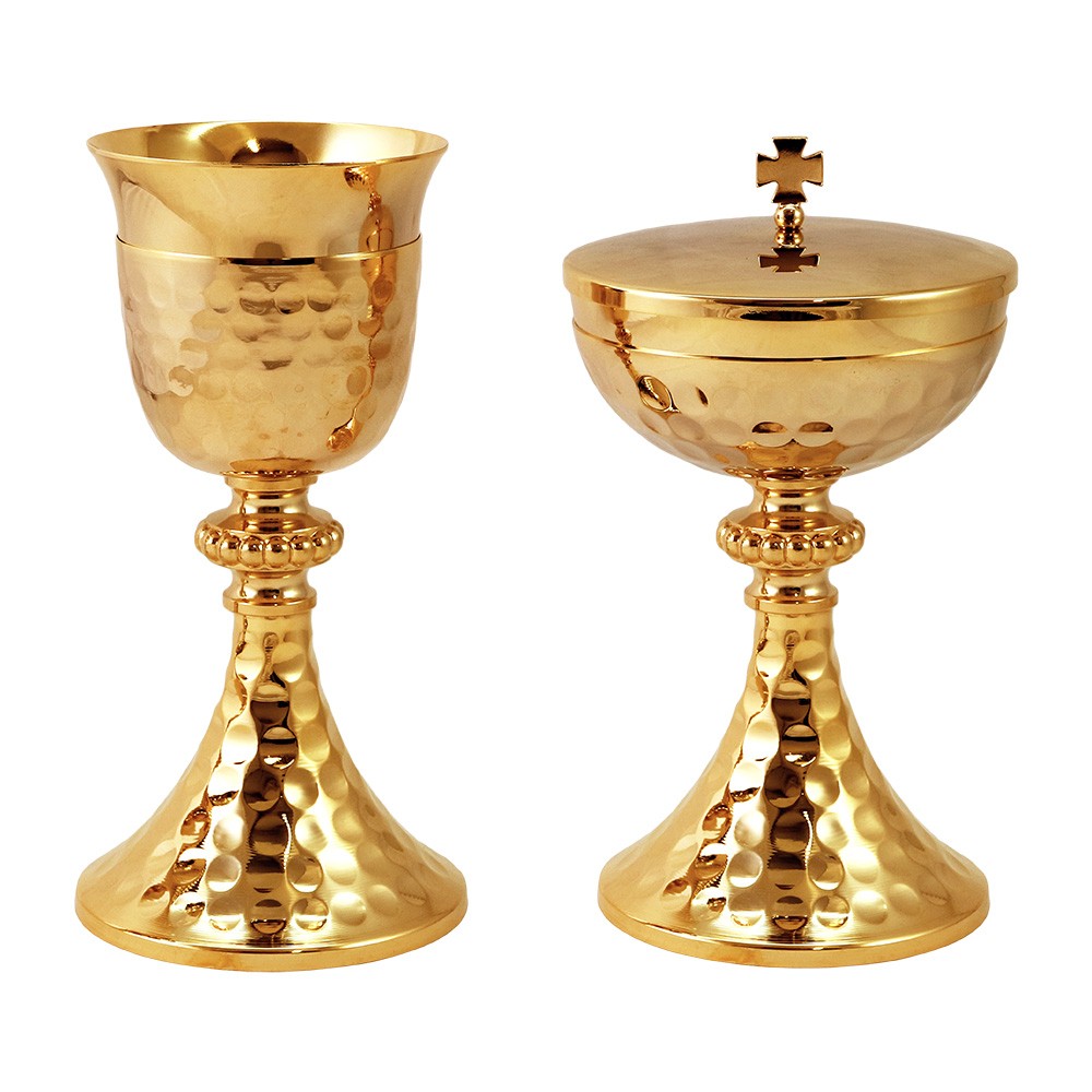 Calice e pisside in ottone dorato con base e sottocoppa martellata.
