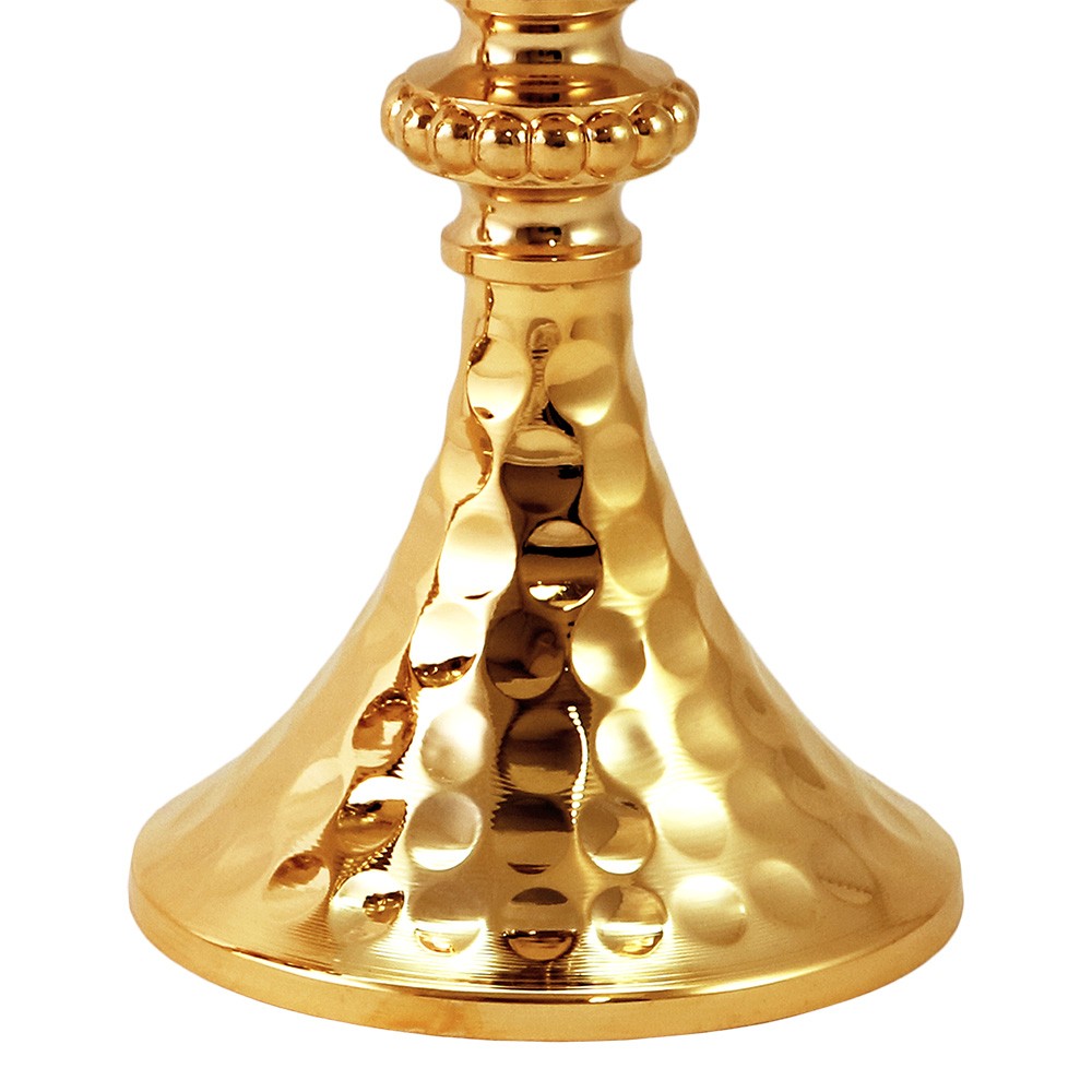 Set messa formato da calice e pisside con base e sottocoppa martellata. Questo set liturgico è interamente in ottone con doratura garantita 24 carati. Particolare è il nodo perlinato realizzato con la tecnica in fusione.