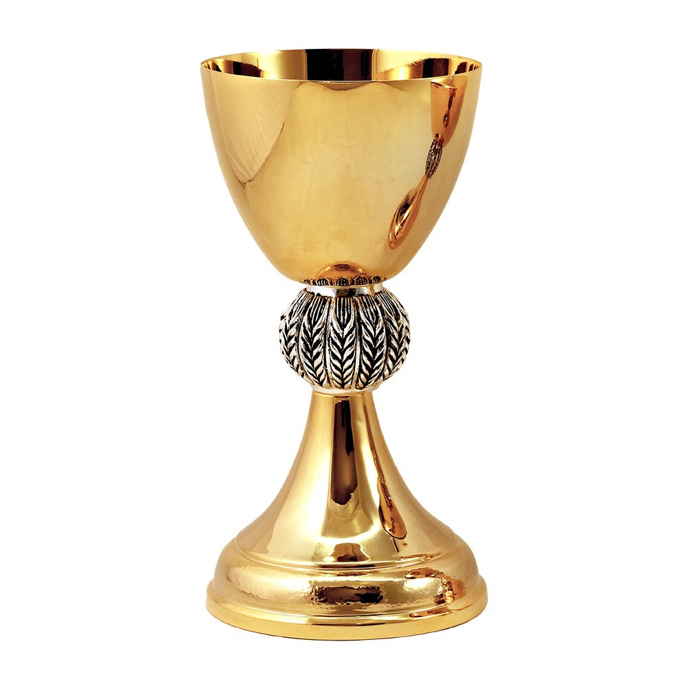 Elegante calice da messa in ottone bagnato in oro 24 carati. Particolare è il nodo decorato con spighe di grano in rilievo con finitura in argento antico.