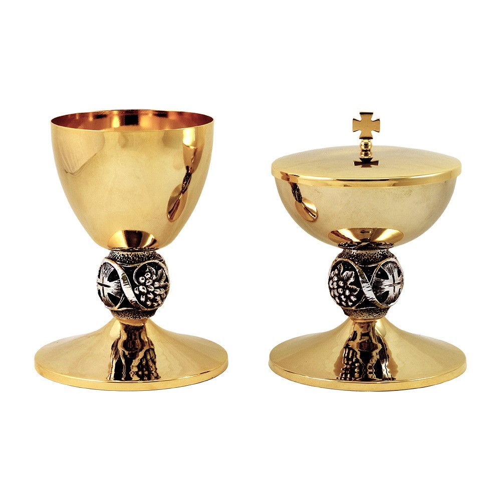 Set Calice e Pisside in ottone dorato con nodo "croce e uva" .