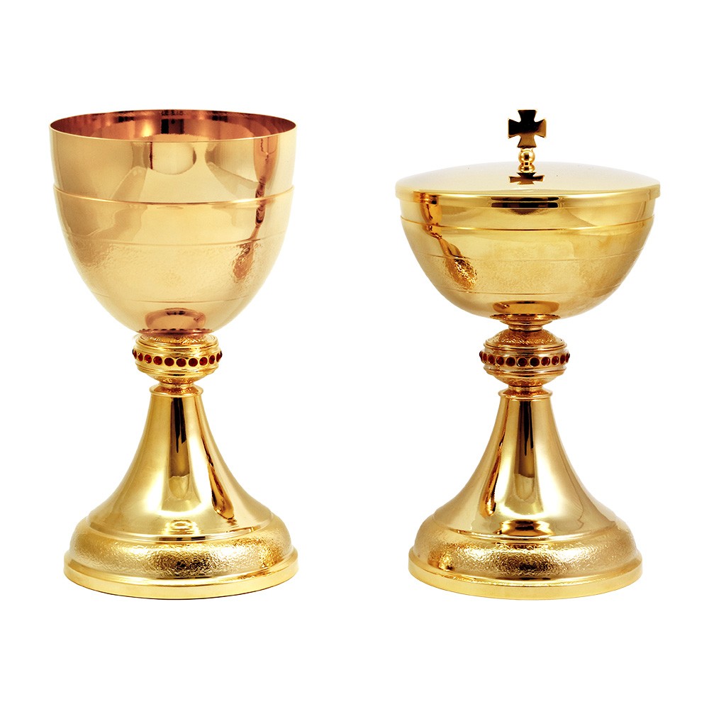Coppia calice e pisside in ottone con finitura dorata realizzato con sottocoppa e base finemente lavorati. Il nodo viene eseguito con la tecnica della fusione, arricchito con pietre rosse.