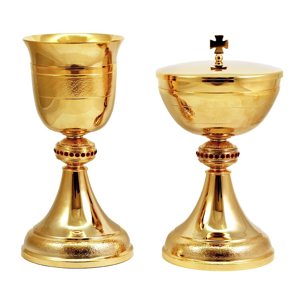 Coppia di calice e pisside in ottone con finitura dorata 24 carati. La base e il sottocoppa sono finemente lavorati. La particolarità di questo calice da messa è il nodo impreziosito da pietre rosse incastonate.