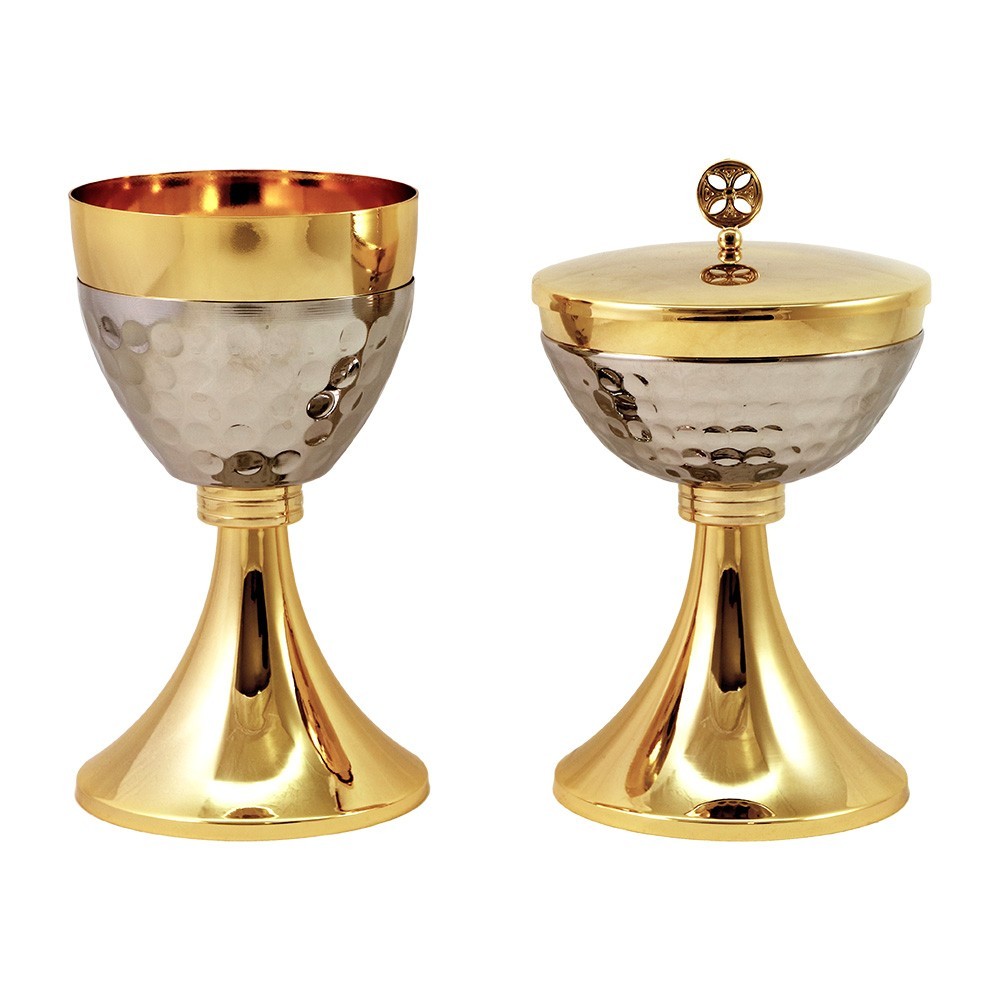 Questo servizio da celebrazione è composto da calice e pisside in ottone oro e argento, acquistabili anche singolarmente. Il sottocoppa si presenta lavorato mediante una particolare tecnica artigianale di martellatura. L'ottone è impreziosito da una finitura galvanica con oro 24 carati.