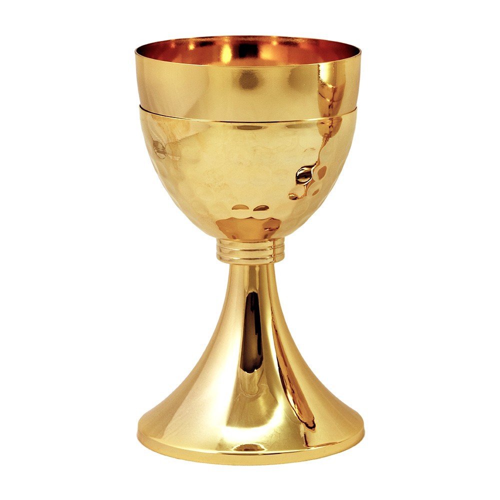Calice da messa in ottone dorato con sottocoppa martellata.