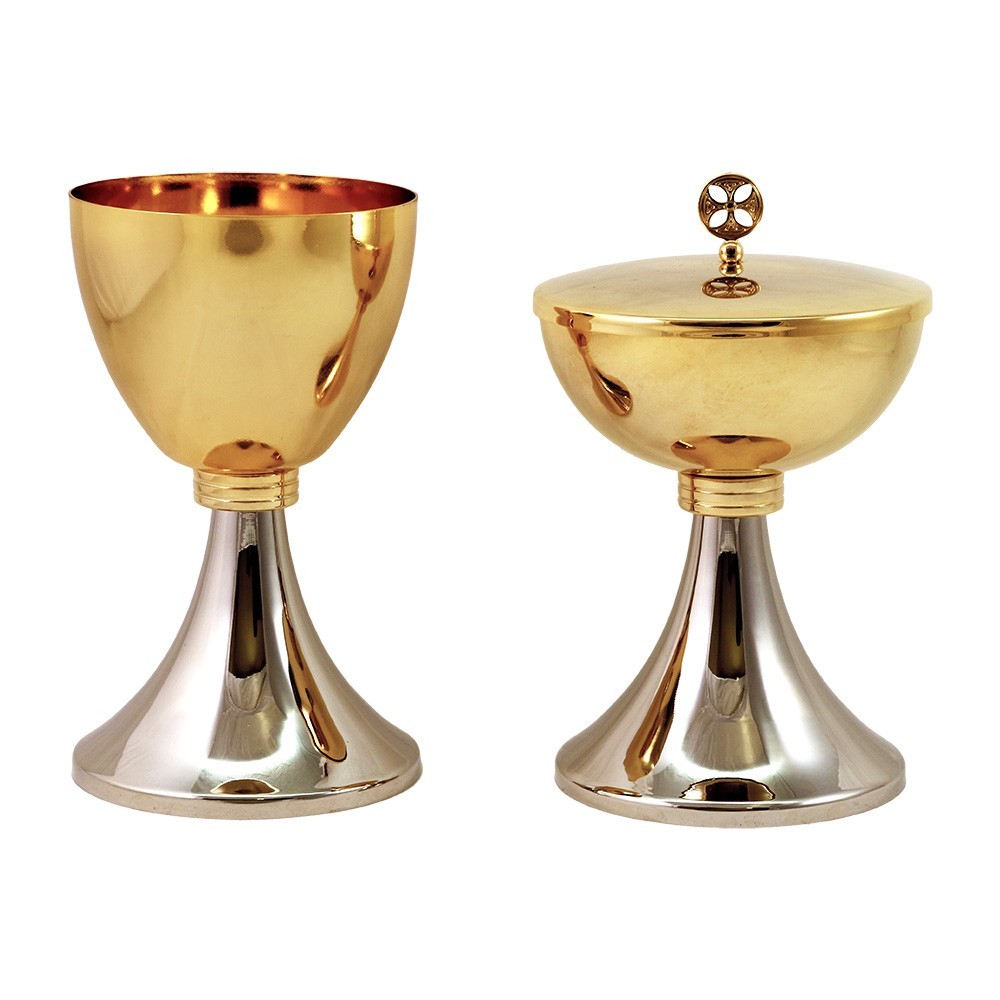 Set da celebrazione composto di calice e pisside in ottone oro e argento, acquistabili anche singolarmente. La base è ottone argentata e la coppa e il nodo sono in ottone dorato. Ottima la qualità della doratura e nichelatura che sono durevoli nel tempo.