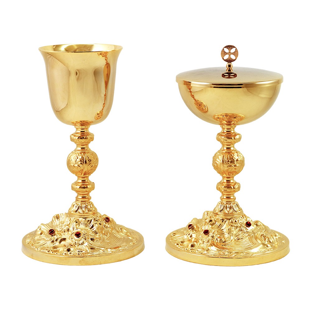 Coppia calice e pisside con base finemente decorata raffigurante delle rose e arricchita con pietre rosse. La base di entrambi gli articoli sacri è realizzata con la tecnica della fusione.