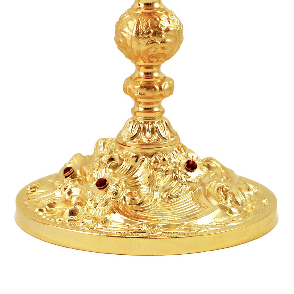 Calice liturgico con base decorata e pietre rosse.