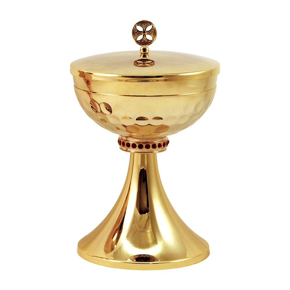 Coppia calice e pisside in ottone dorato impreziosito con pietre rosse.