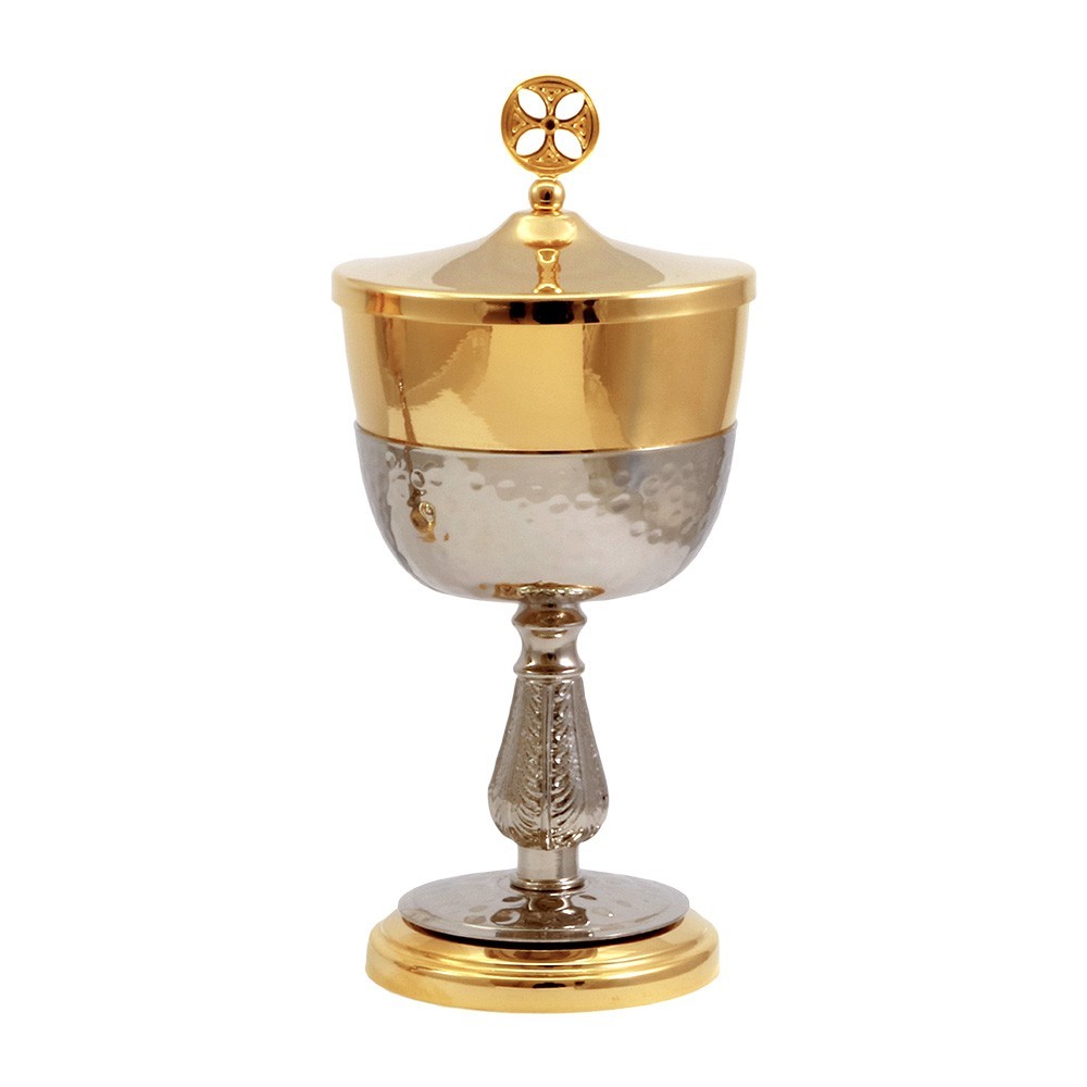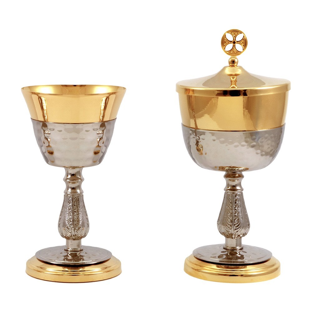 Set liturgico composto di mini calice e mini pisside interamente in ottone bicolore oro e argento. La base e il sottocoppa sono realizzati attraverso un particolare lavoro di martellatura, mentre il nodo è in fusione finemente decorato.