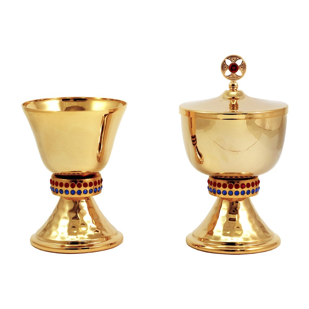 Coppia calice e pisside in ottone con nodo con due file di pietre colorate.