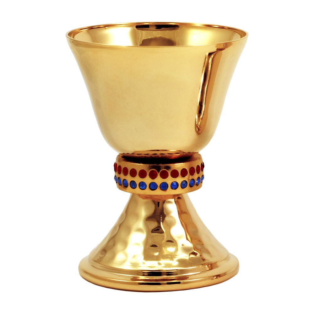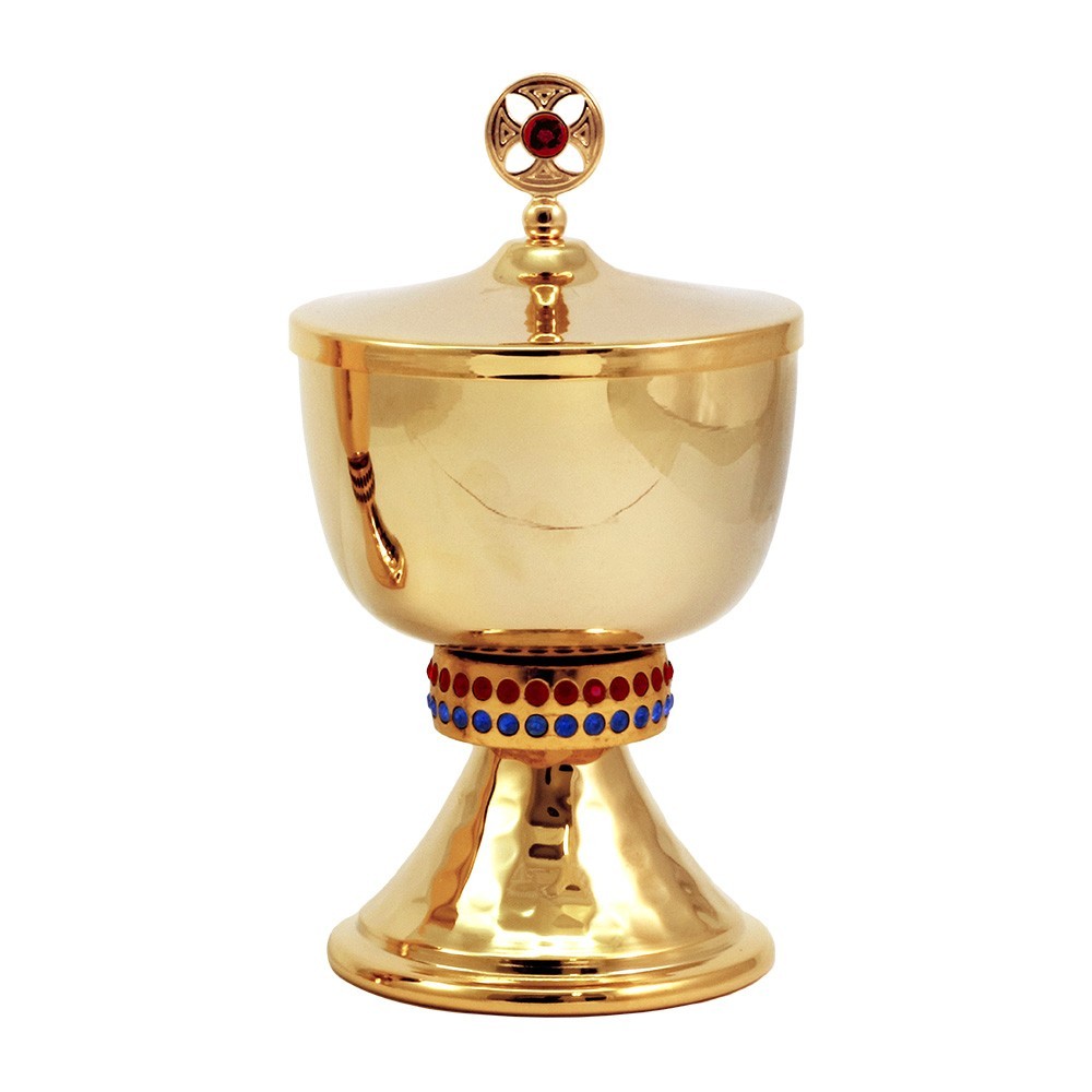 Mini calice e pisside in ottone dorato con pietre colorate blu e rosse.